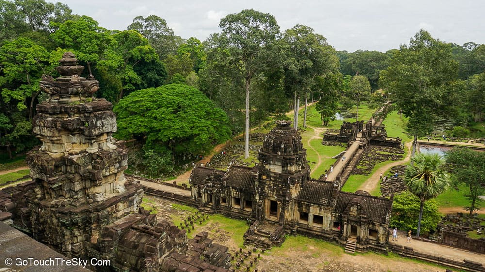 จากประตูชัยทางทิศตะวันออกของนครธม ข้ามแม่น้ำเสียมเรียบไปเล็กน้อย จะเจอกับ ปราสาทตาแก้ว (Ta Keo) ตัวปราสาทจัดว่ายังอยู่ในสภาพที่ดี มีความสูง 22 เมตร ปรางค์บริวาร 4 มุม ตรงกลางเป็นปรางค์ประธานบนฐานยกสูง กล่าวกันว่าปราสาทตาแก้วซึ่งมีฐานกำแพงขนาดใหญ่ เป็นต้นแบบของนครวัด