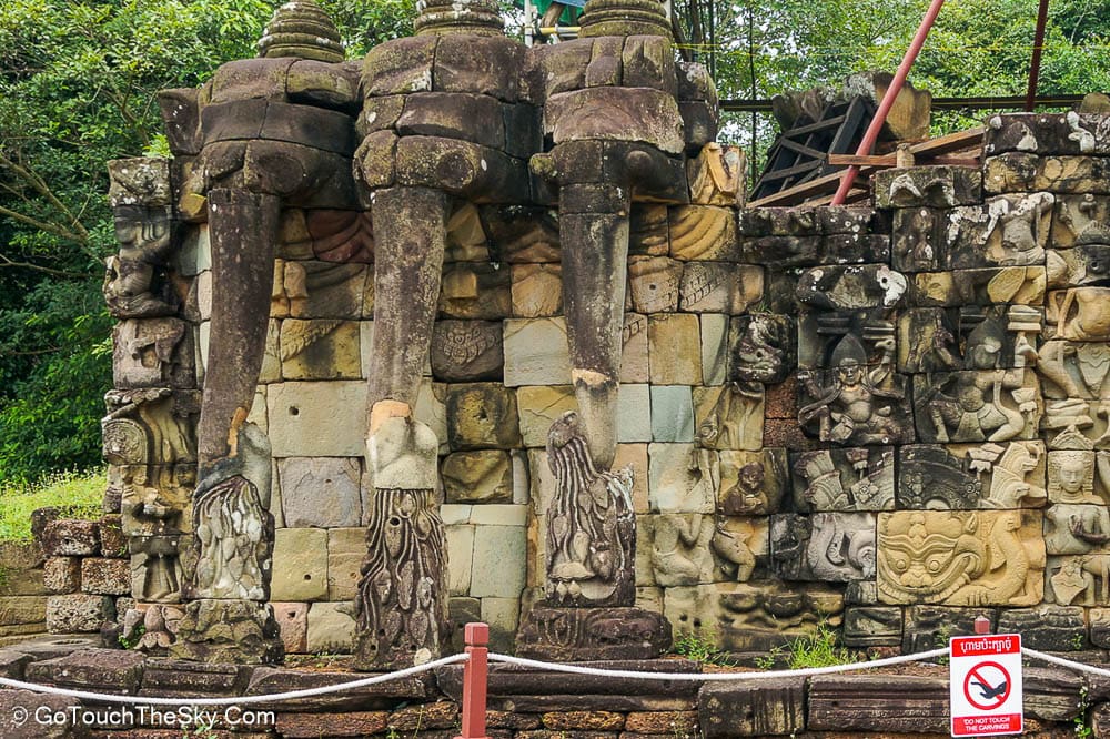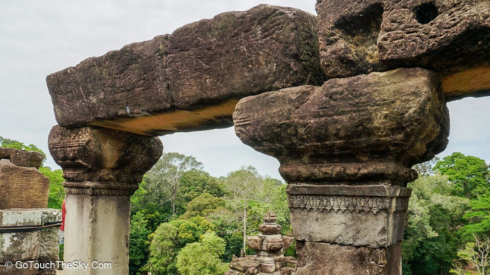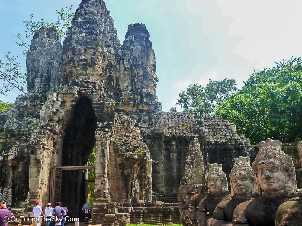 ซุ้มประตูทางเข้า มีหินทรายเเกะสลักรูปพระพักตร์ของพระโพธิสัตว์อวโลกิเตศวรอยู่บนยอดทั้งสี่ทิศ ด้วยสายตาที่ทอดมองลงต่ำและรอยยิ้มแบบบายนที่เปี่ยมด้วยความเมตตากรุณา ทำให้ผู้พบเห็นมิอาจจะละสายตาไปได้ง่ายๆ ด้านข้างของกรอบประตูจะเป็นประติมากรรมลอยตัวพระอินทร์ทรงช้างเอราวัณ 3 เศียร เป็นภาพที่โอฬาร น่าตื่นตาตื่นใจ และประทับใจอาคันตุกะทุกคนที่ต้องผ่านซุ้มประตูนี้เข้าไป