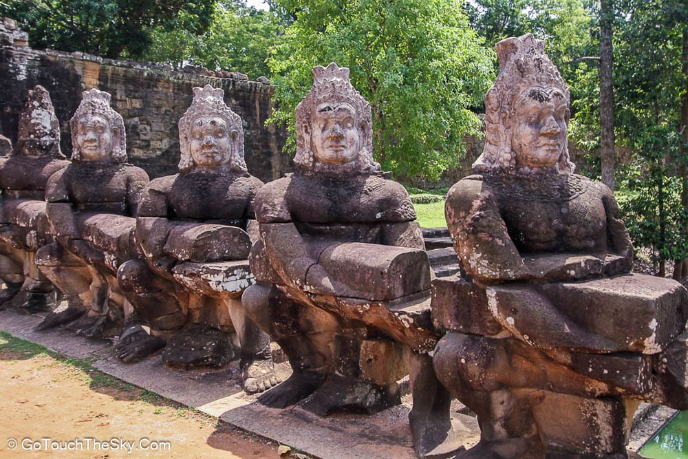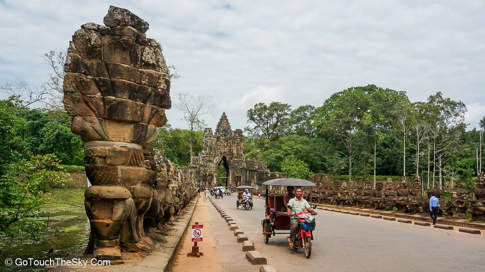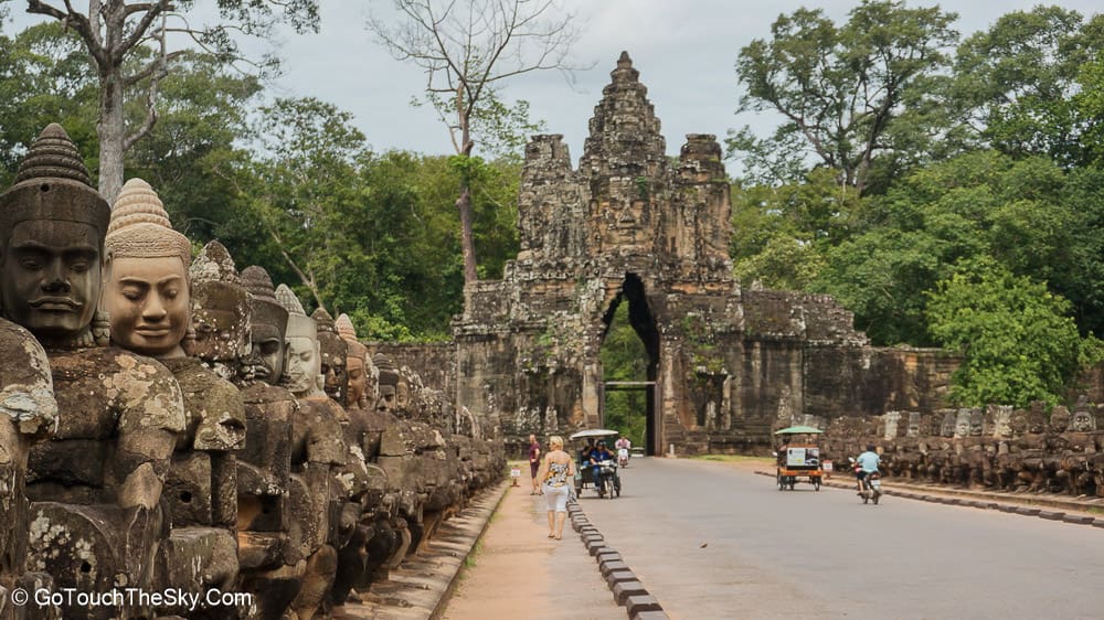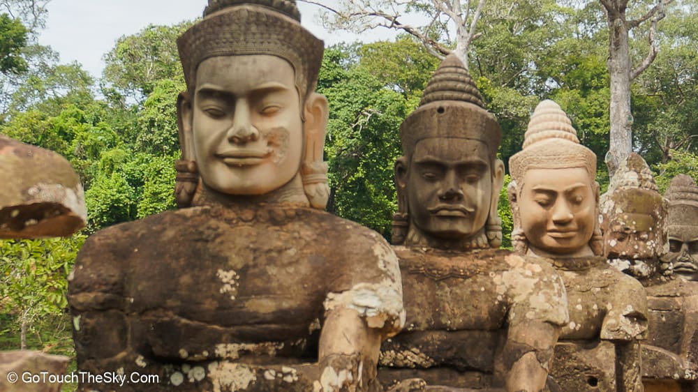 เมื่อเดินทางจากนครวัดมาถึงนครธมทางประตูเมืองด้านทิศใต้ จะพบกับสะพานหินสลักขนาดใหญ่ที่สร้างขึ้นเพื่อข้ามคูเมือง สองข้างของสะพานมีรูปประติมากรรมลอยตัว (หินแกะสลัก) ของเทวดาและยักษ์ 54 องค์กำลังยื้อยุดฉุดดึงพญานาคเพื่อกวนเกษียรสมุทร อันเป็นตอนเริ่มต้นจากนิยายปรัมปราที่พวกพรามหณ์เล่าถึงตอนกะเนิดโลกมนุษย์และจักรวาล