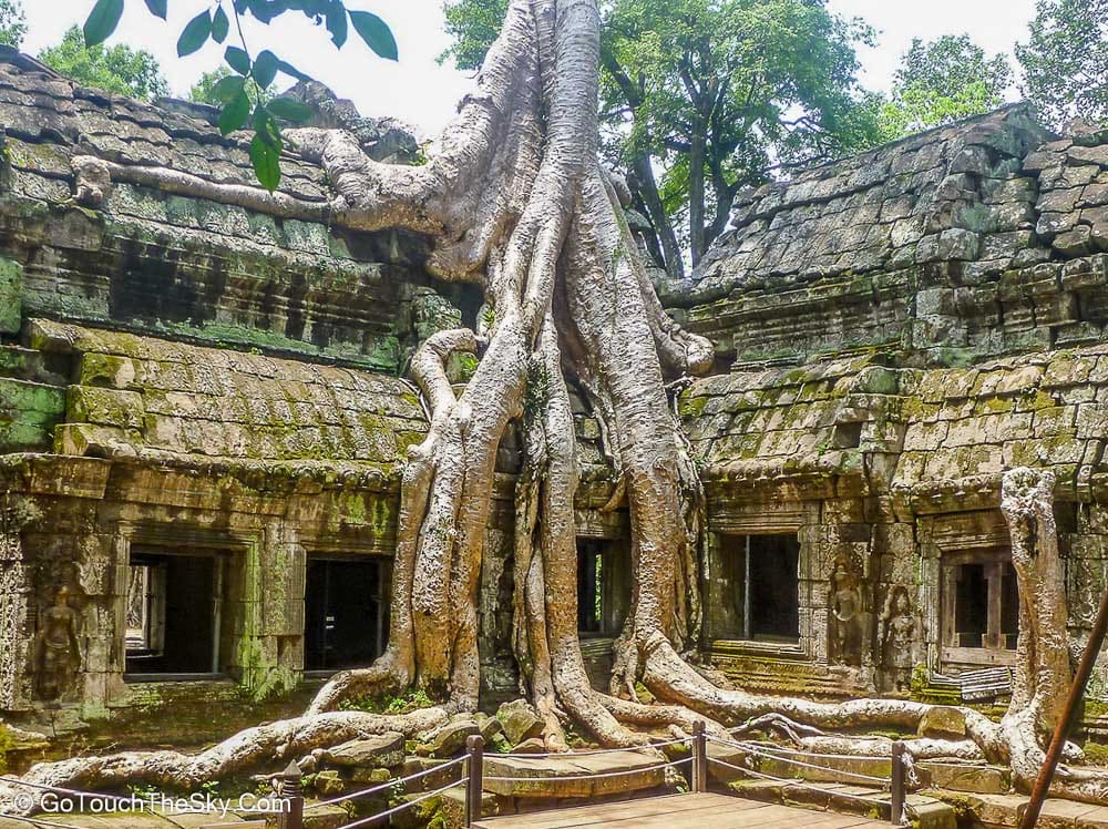 จุดหมายสุดท้ายของเราในวันนี้ คือ ปราสาทตาพรหม (Ta Prohm) พระเจ้าชัยวรมันที่ 7 โปรดให้สร้างขึ้นเพื่อถวายแก่พระราชมารดา เป็นวัดในพุทธศาสนาขนาดใหญ่มาก สร้างตามแบบวัดขอมในยุคสุดท้าย ช่วงที่ปราสาทถูกปล่อยทิ้งรกร้างไว้หลายร้อยปี ทำให้เกิดต้นไม้ใหญ่ขึ้นปกคลุม มองดูเหมือนประหนึ่งว่าจะกลืนกินปราสาทตาพรหม