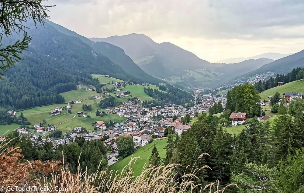 จากบริเวณสถานีกระเช้า Seceda ที่อยู่บนเนิน สามารถมองเห็นสถานี Alpe di Siusi ที่อยู่อีกด้านหนึ่งของเมืองได้อย่างชัดเจน
