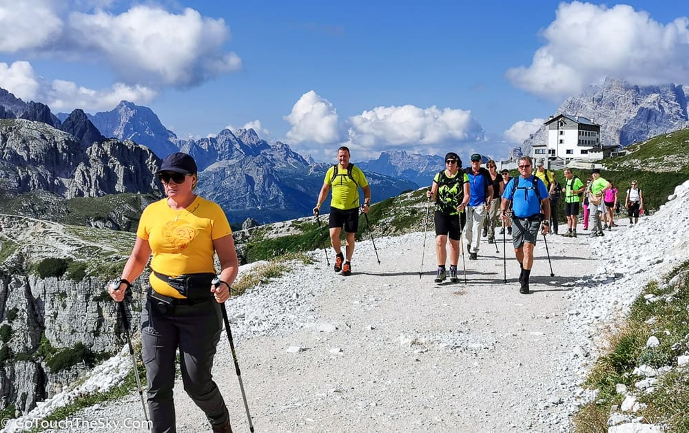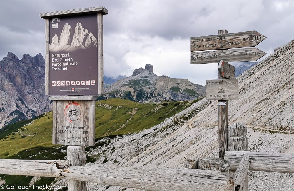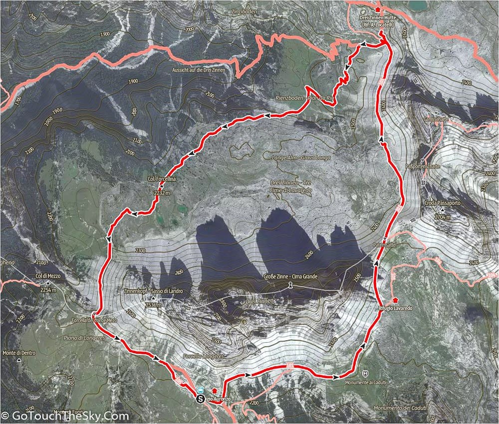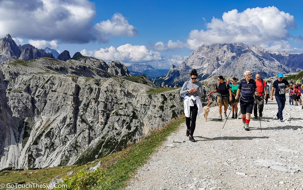 จากจุดนี้การเที่ยวชมต้องอาศัยการเดินเท้าเเต่เพียงอย่างเดียว (ยกเว้นจะขอชมวิวเเค่ตรงระเบียงเท่านั้น ^^) เส้นทางท่องเที่ยวมาตรฐานคือการเดินเป็นวงกลมในทิศย้อนเข็มนาฬิกา จากจุดเริ่มต้นที่ Rifugio Auronzo ไปยัง Rifugio Locatelli อันเป็นที่พักอีกเเห่งที่อยู่ด้านทิศเหนือ (ซึ่งเป็นจุดชมวิวที่สวยที่สุดของ Tre Cime) เเล้วเดินวนกลับมาที่เดิมเป็นวงกลม ระยะทางทั้งสิ้นประมาณ 10 กิโลเมตร เส้นทางเดินค่อนข้างง่ายเพราะเป็นทางที่นักท่องเที่ยวใช้เป็นประจำอยู่เเล้ว เเต่มีการเดินขึ้น-ลงเนินบ้าง รวมเวลาเดิน-หยุดพัก-ถ่ายรูปแบบสบายๆ เผื่อเวลาไว้ประมาณ 3-5 ชั่วโมง