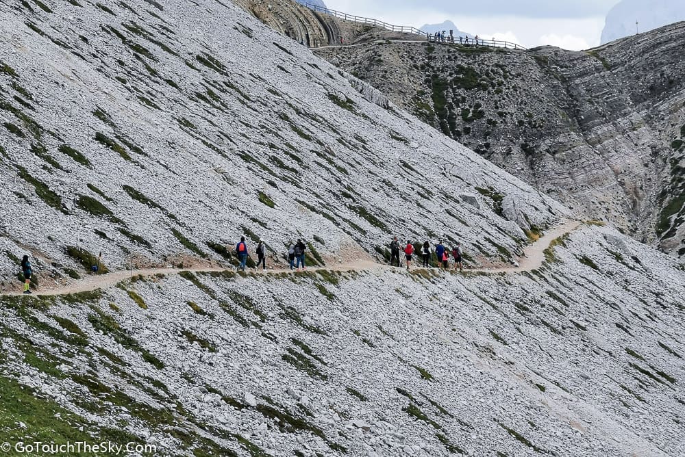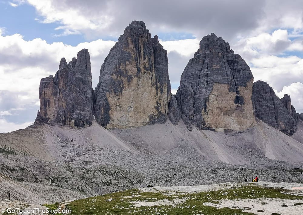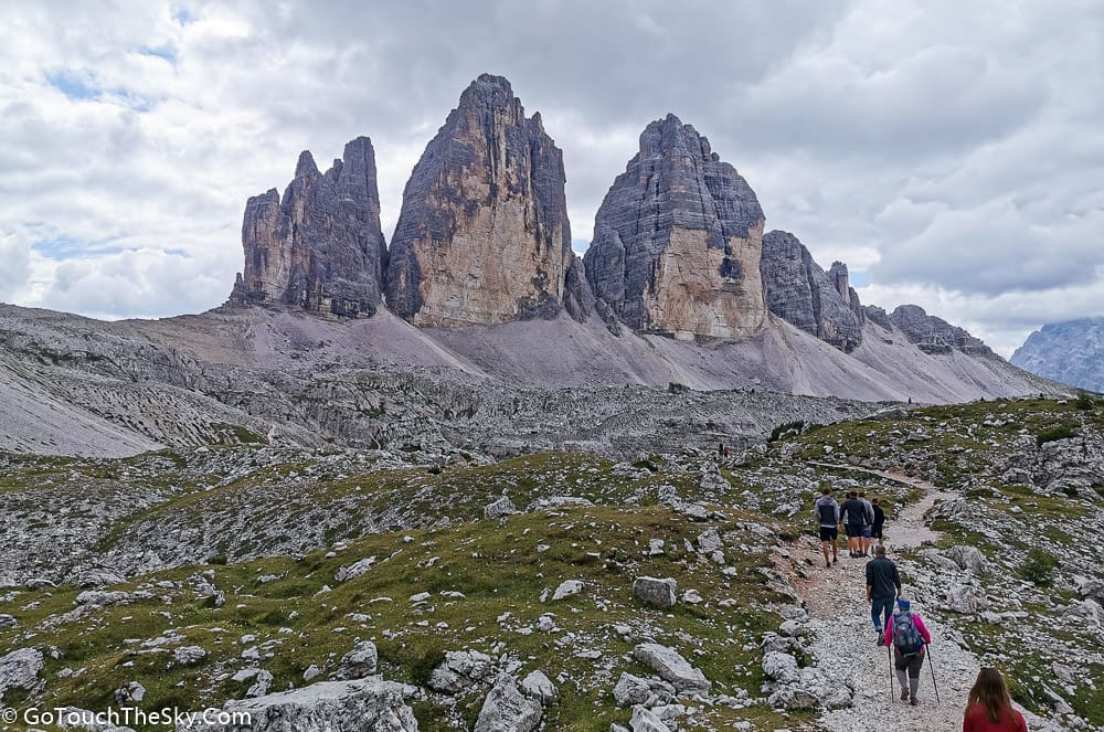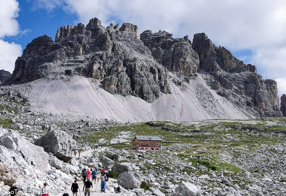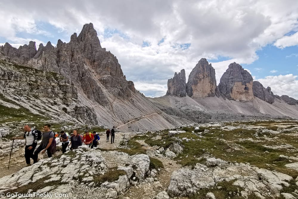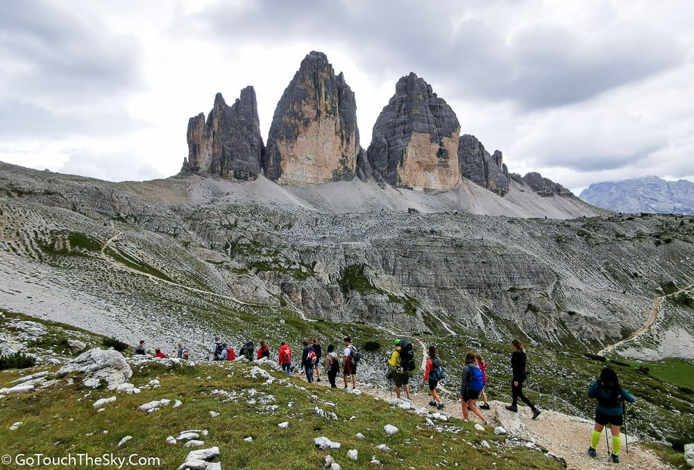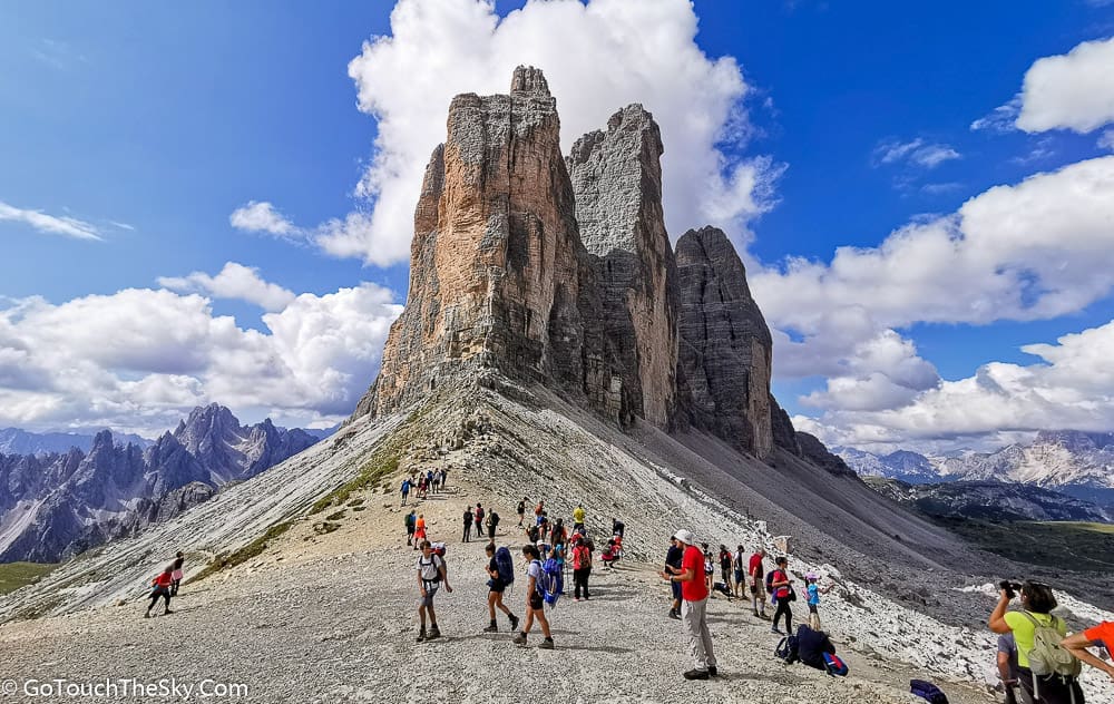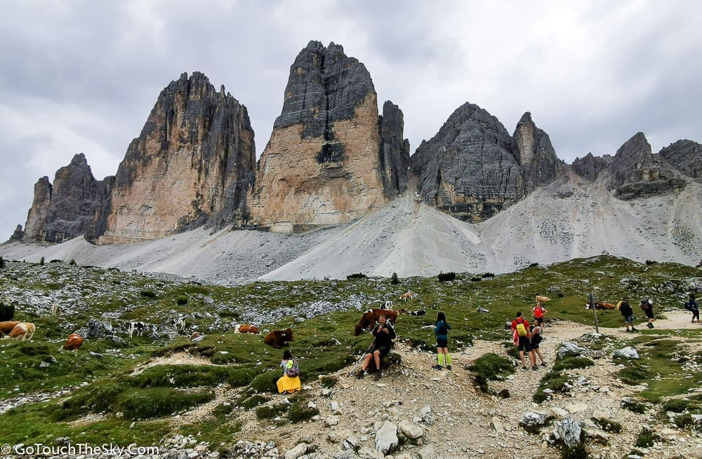 หลังจากเดินขึ้นเนินขนาดย่อมๆจนร้องอยากหันหลังกลับ ก็จะได้รางวัลเป็นภาพของ Tre Cime ด้านทิศตะวันออกในระยะประชิดตัว มันยิ่งใหญ่อลังการกว่าที่เราคิดไว้ในใจ (สังเกตตัวคนในภาพเมื่อเทียบกับขนาดของเขาสามเกลอนี้ ^^)