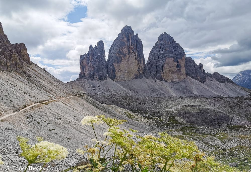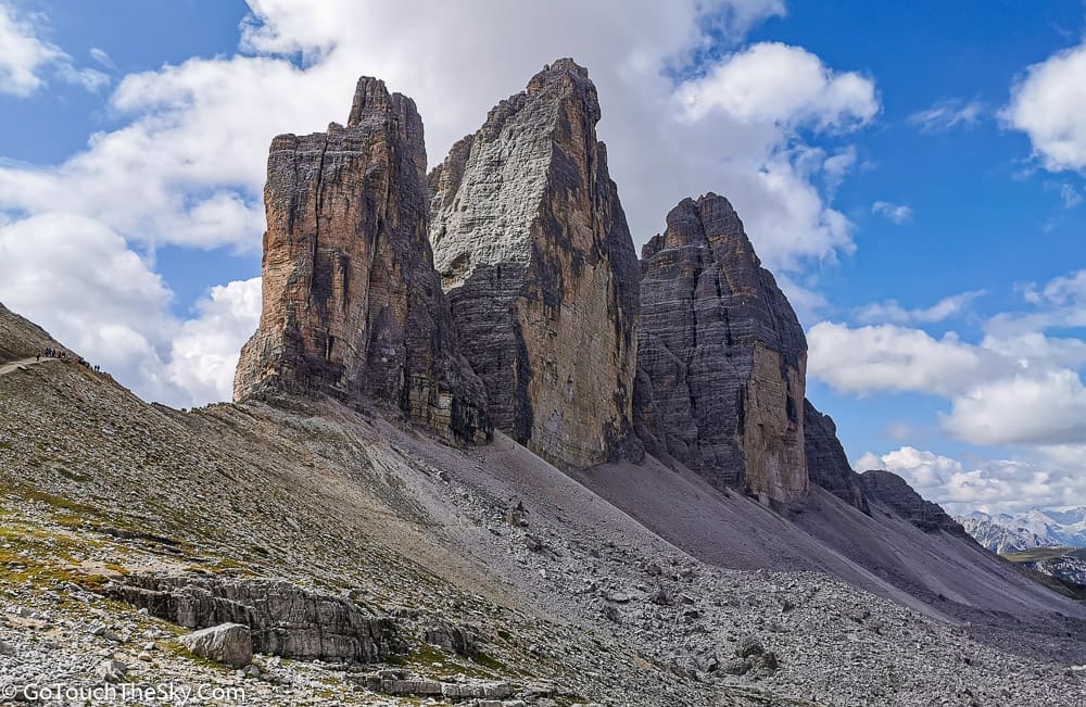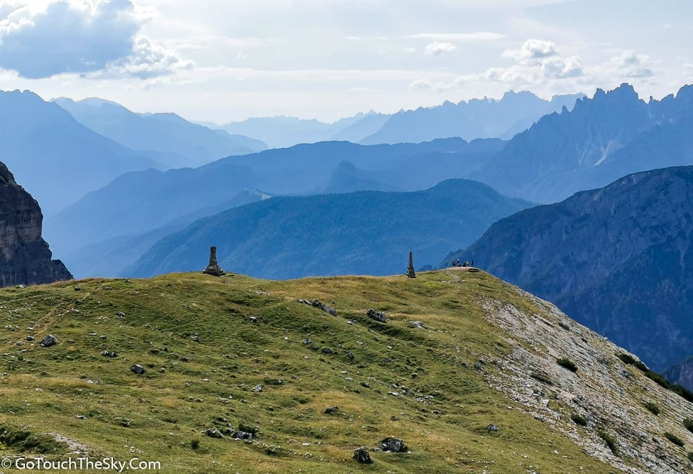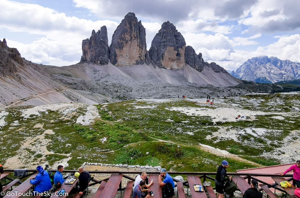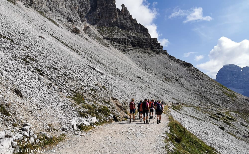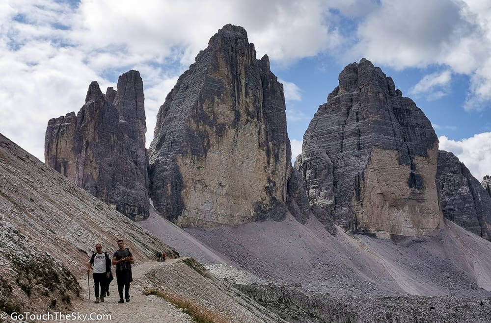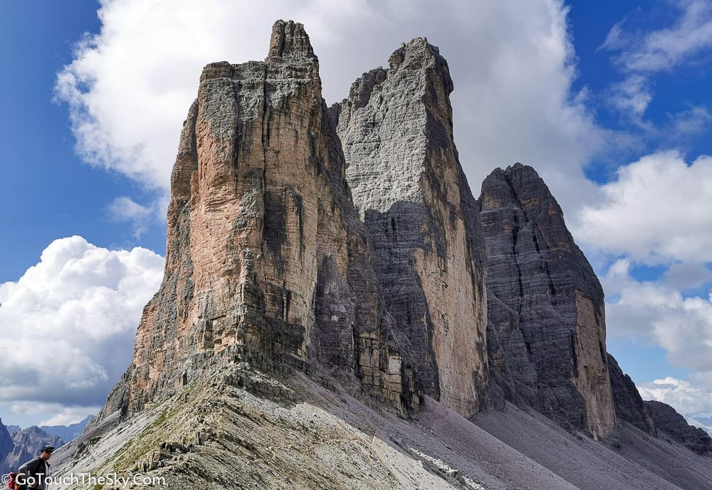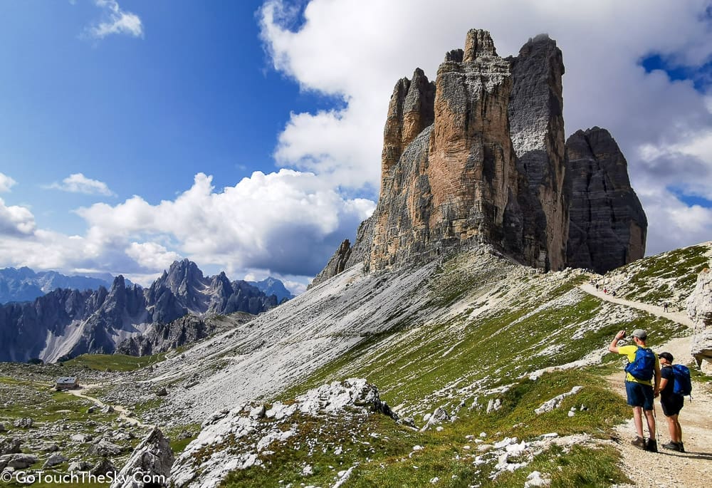 หลังจากเดินขึ้นเนินขนาดย่อมๆจนร้องอยากหันหลังกลับ ก็จะได้รางวัลเป็นภาพของ Tre Cime ด้านทิศตะวันออกในระยะประชิดตัว มันยิ่งใหญ่อลังการกว่าที่เราคิดไว้ในใจ (สังเกตตัวคนในภาพเมื่อเทียบกับขนาดของเขาสามเกลอนี้ ^^)
