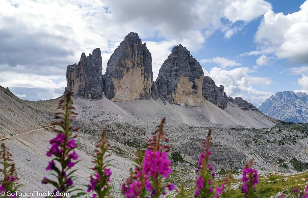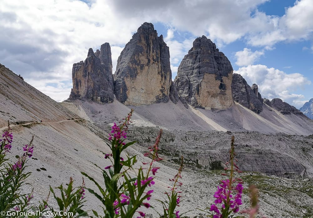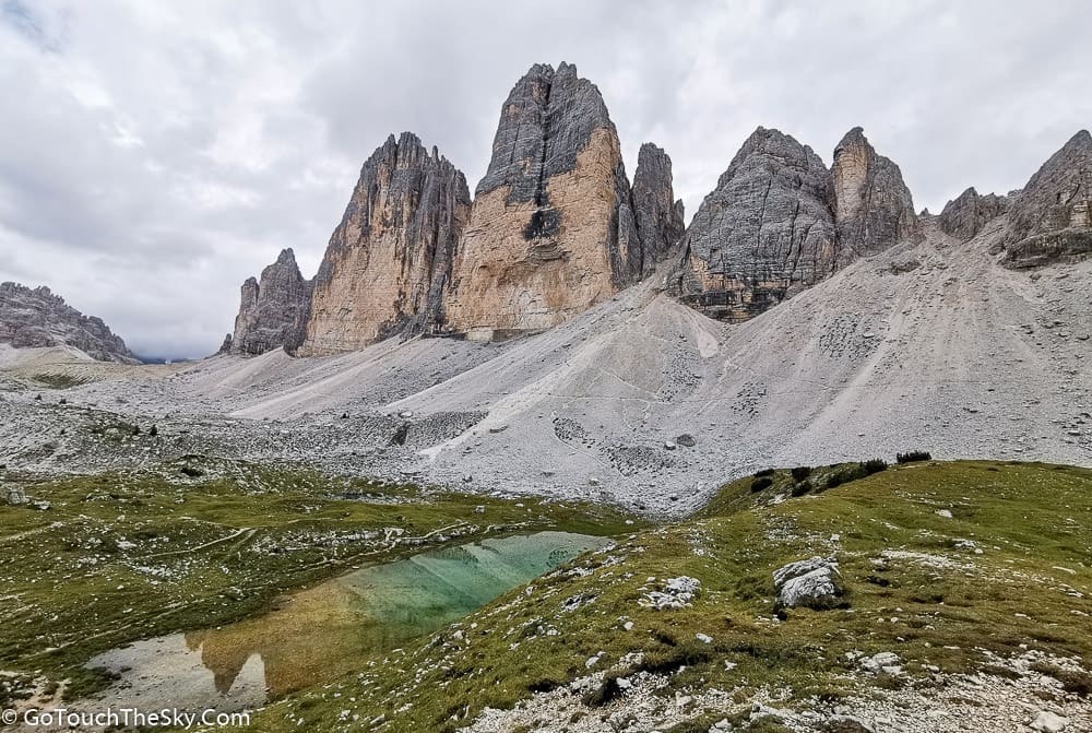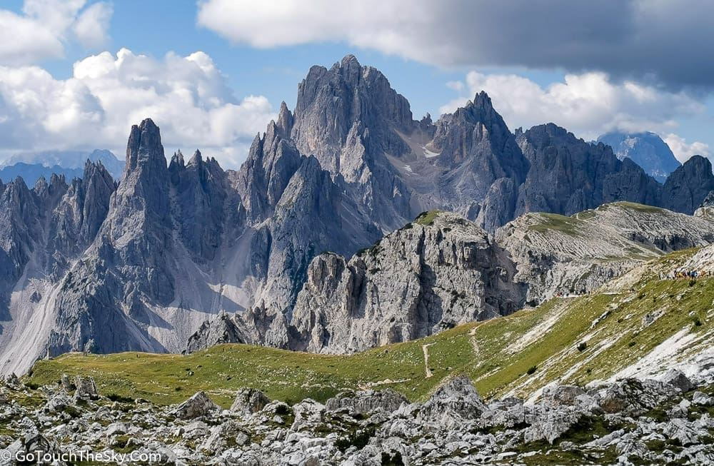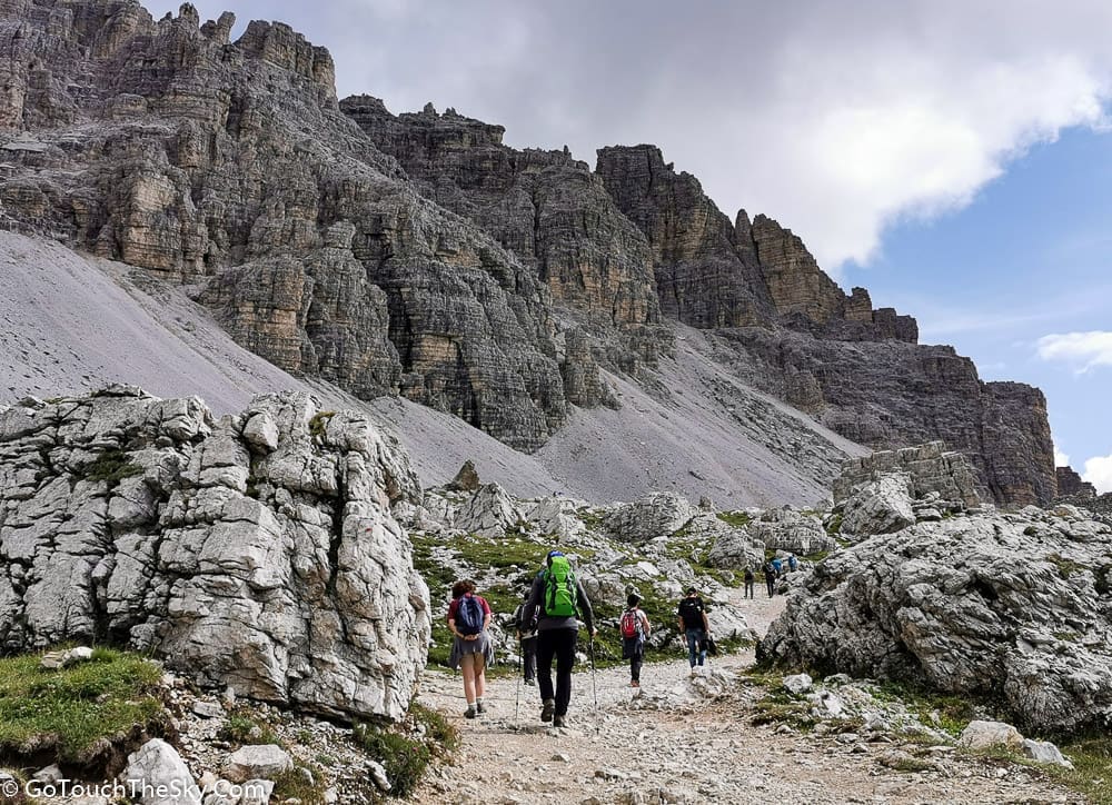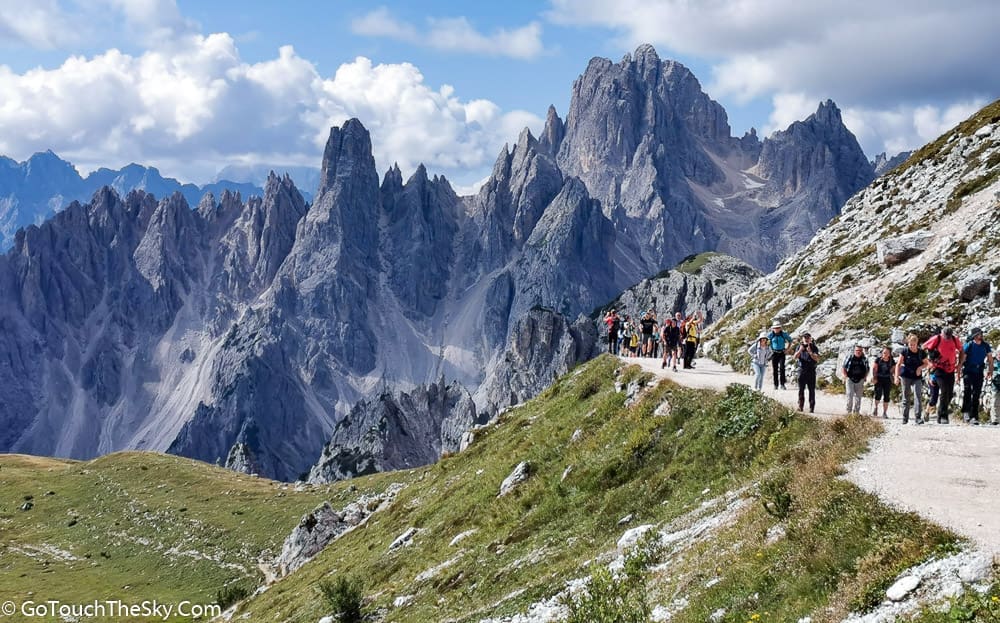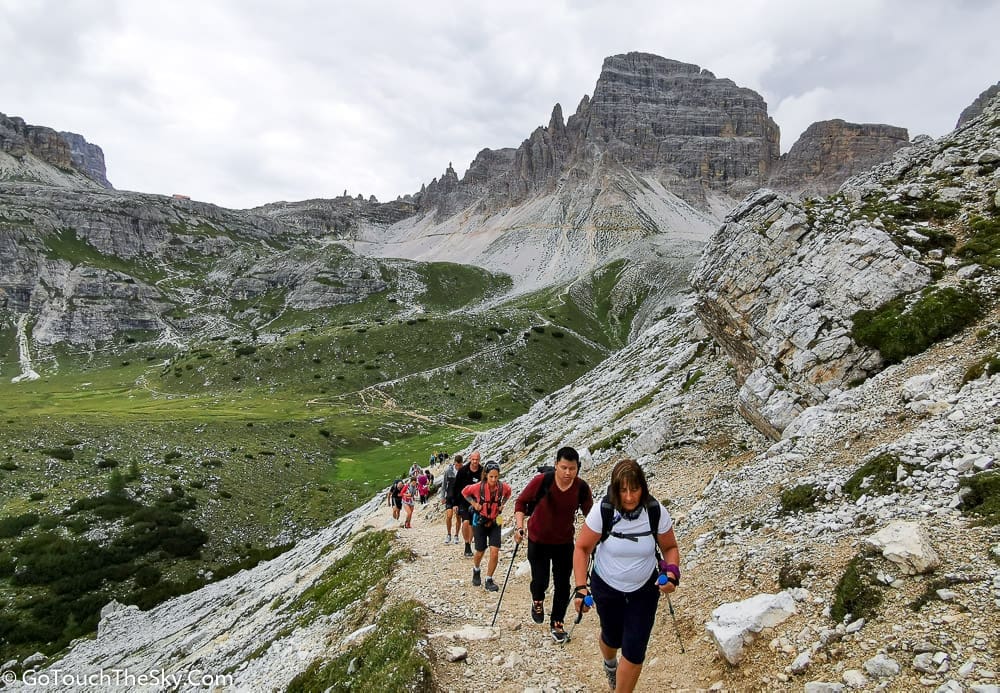 หลังจากเดินขึ้นเนินขนาดย่อมๆจนร้องอยากหันหลังกลับ ก็จะได้รางวัลเป็นภาพของ Tre Cime ด้านทิศตะวันออกในระยะประชิดตัว มันยิ่งใหญ่อลังการกว่าที่เราคิดไว้ในใจ (สังเกตตัวคนในภาพเมื่อเทียบกับขนาดของเขาสามเกลอนี้ ^^)
