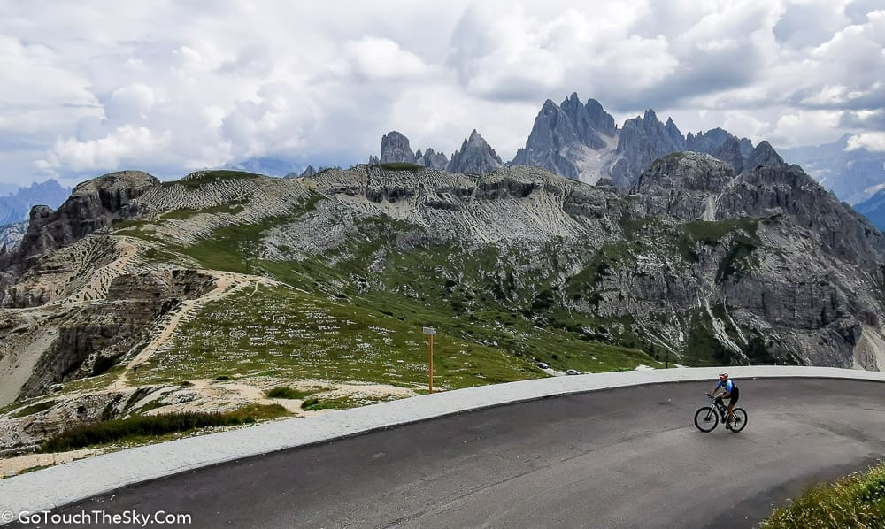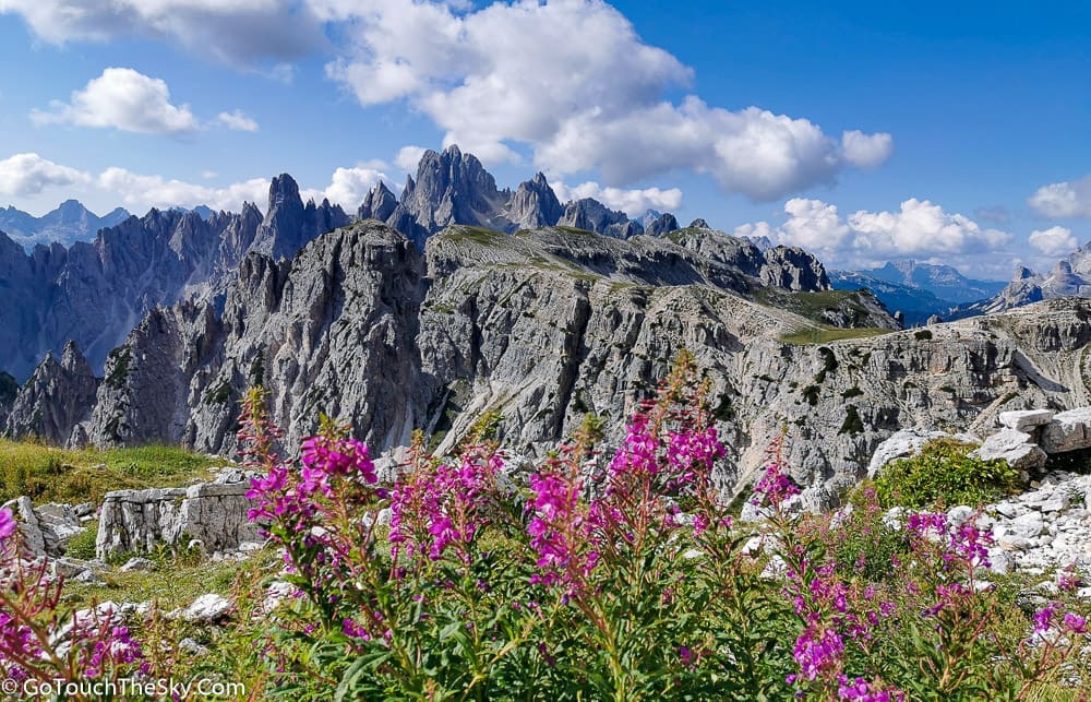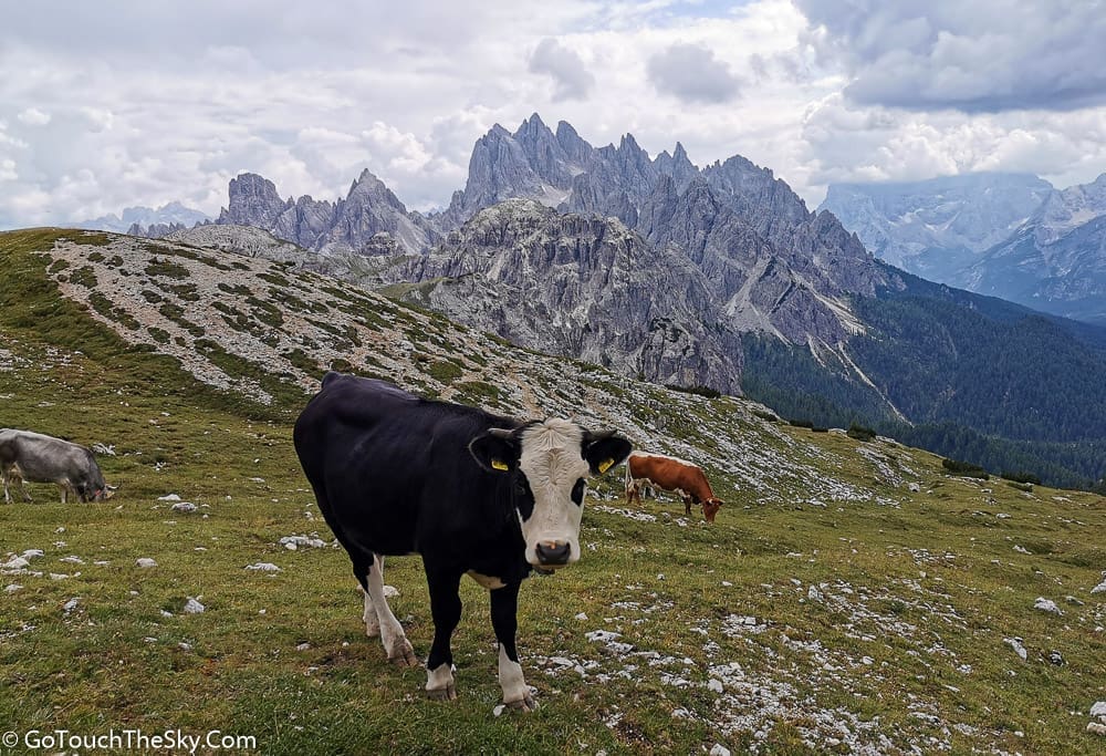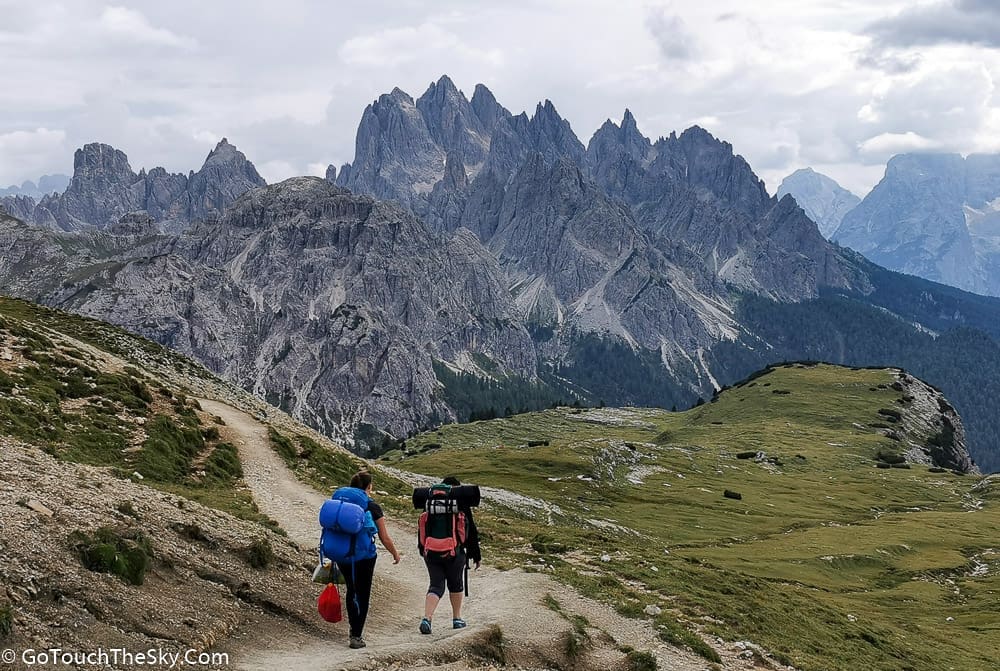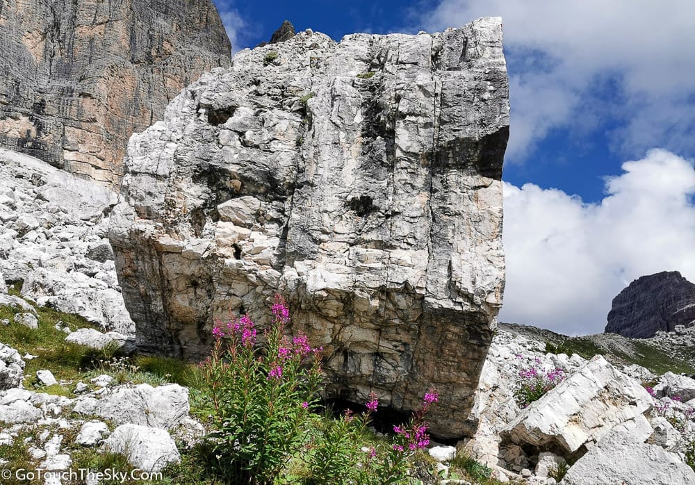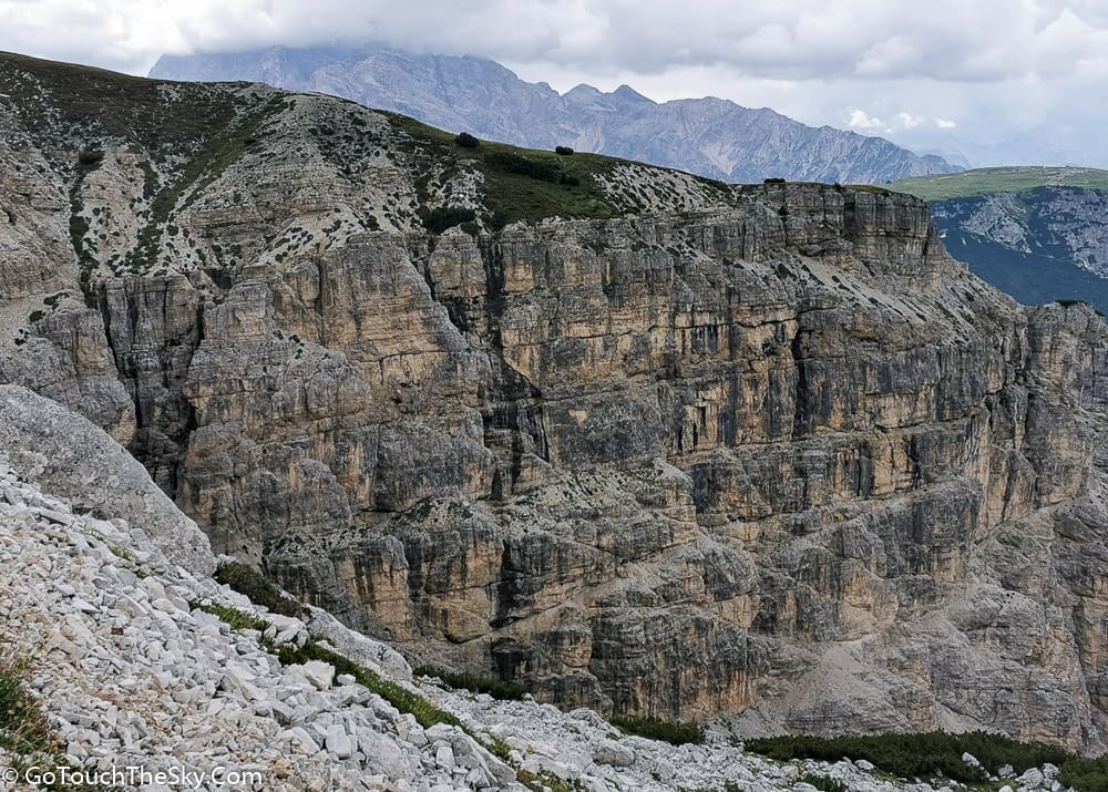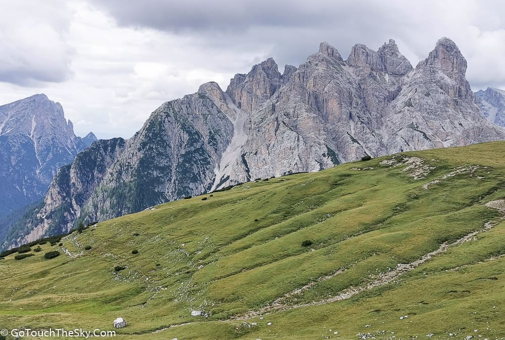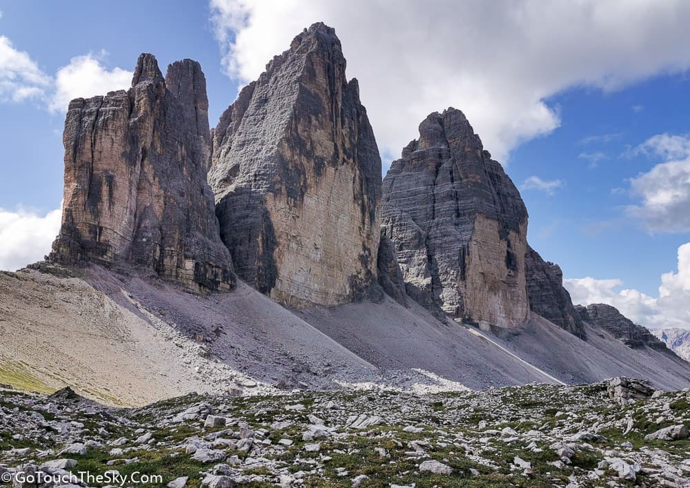 หลังจากเดินขึ้นเนินขนาดย่อมๆจนร้องอยากหันหลังกลับ ก็จะได้รางวัลเป็นภาพของ Tre Cime ด้านทิศตะวันออกในระยะประชิดตัว มันยิ่งใหญ่อลังการกว่าที่เราคิดไว้ในใจ (สังเกตตัวคนในภาพเมื่อเทียบกับขนาดของเขาสามเกลอนี้ ^^)