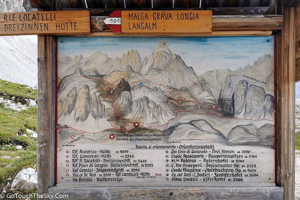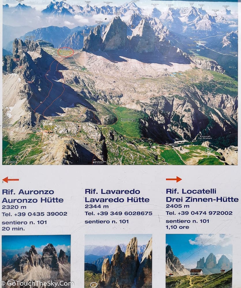 Rifugio Auronzo ตั้งอยู่ทางด้านทิศใต้ของ Tre Cime เป็นที่พักและร้านอาหารหนึ่งในไม่กี่เเห่งของที่นี่ นอกจากนี้ยังเป็นจุดเริ่มต้นและสิ้นสุดการเดิน(เท้า) เพื่อเที่ยวชม Tre Cime ของนักท่องเที่ยวทุกคนด้วย