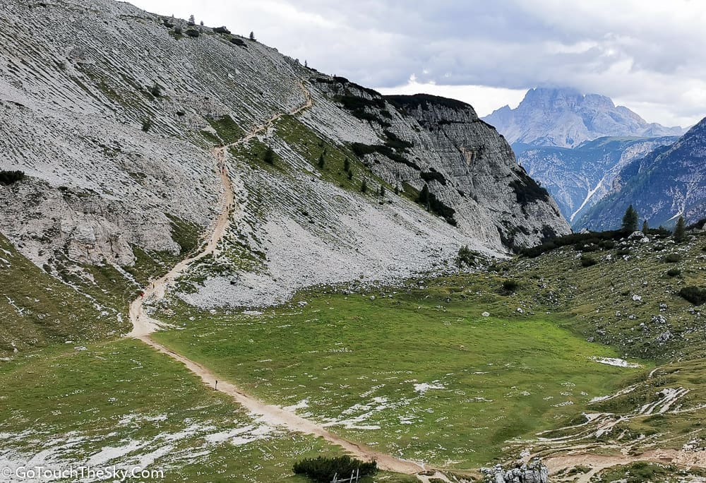 หลังจากเดินเลาะไปตามไหล่เขาไม่นาน ก็จะเริ่มมองเห็น Rifugio Locatelli อันเป็นที่พัก-ร้านอาหารหนึ่งเดียวในด้านนี้ ซึ่งเป็นจุดหมายปลายทาง (ในครึ่งเเรก) ของเราอยู่ไกลๆ