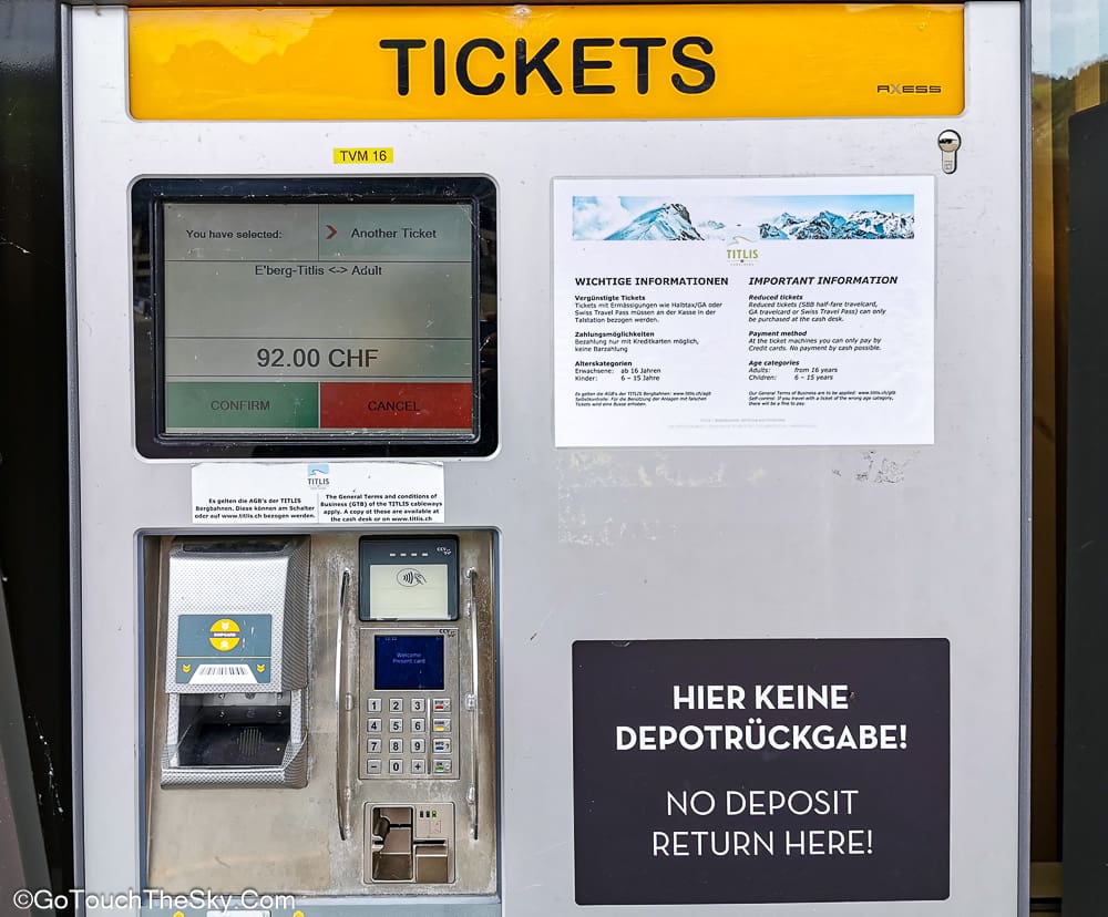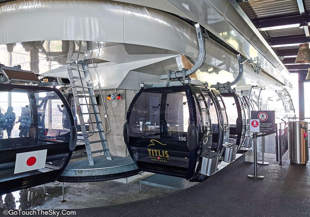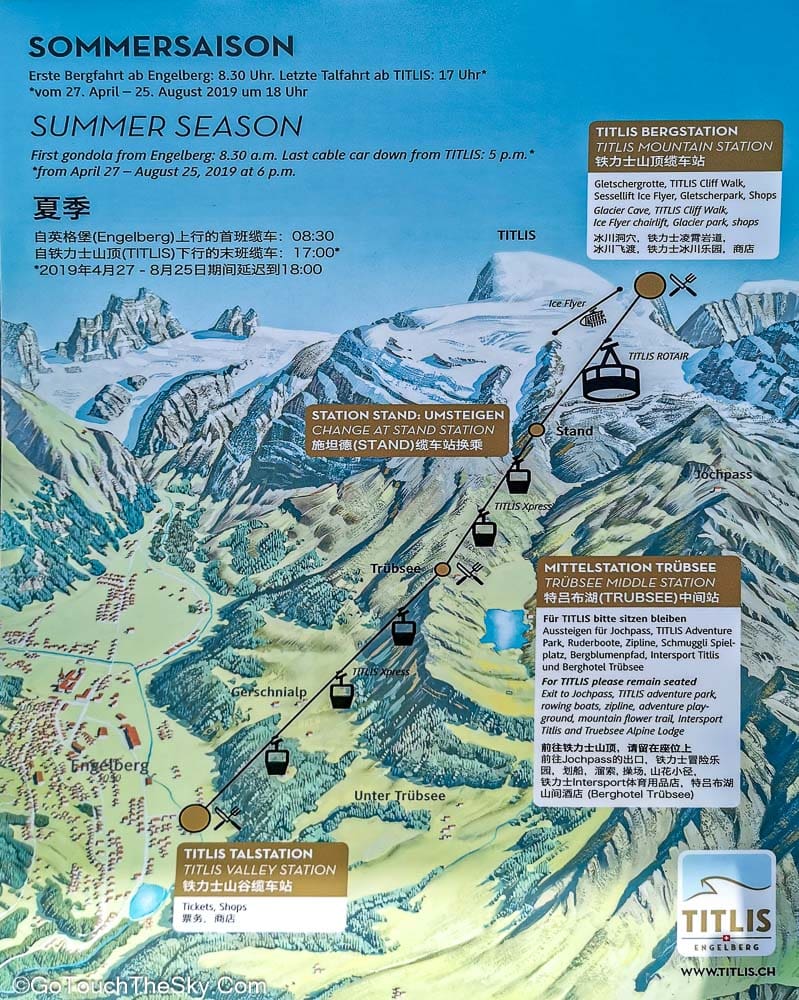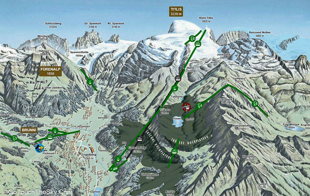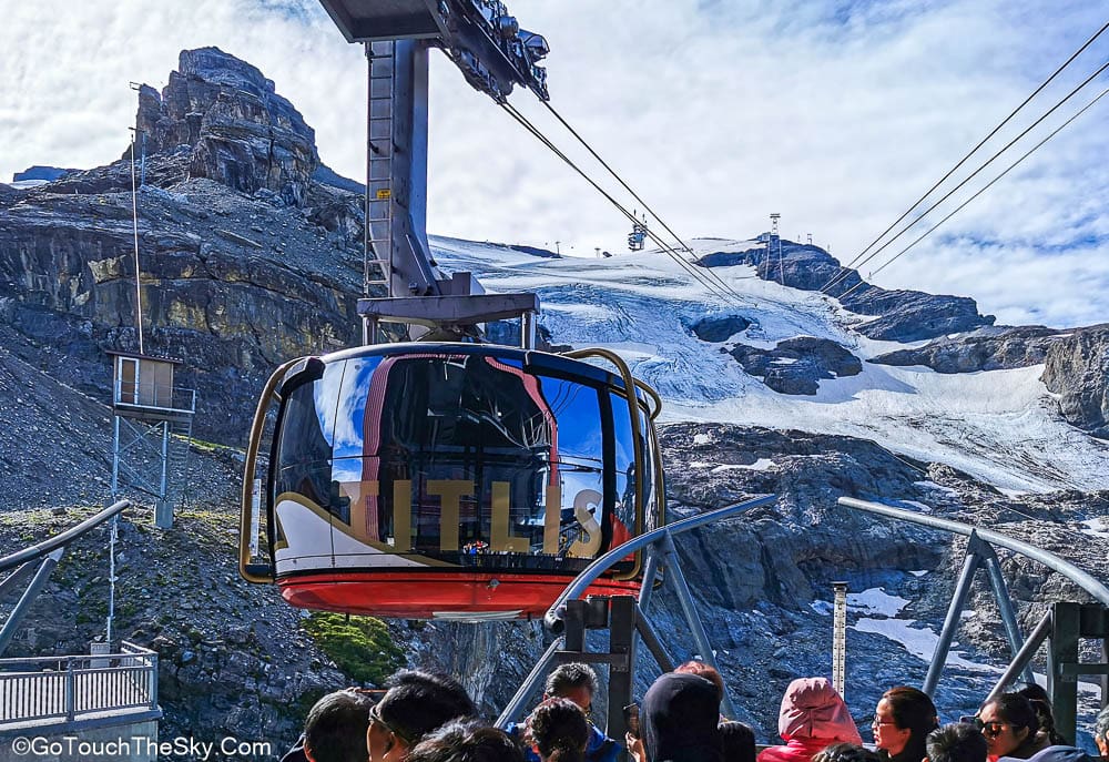 กระเช้าไฟฟ้า (Cable Car) จะมีสองช่วง จากสถานีหลัก (Titlis Valley Station) ไปยังสถานี Stand เป็นกระเช้าไฟฟ้าแบบปรกติ (TITLIS Xpress cable car) ช่วงที่สองจากสถานี Stand ไปถึงสถานียอดเขา (Titlis Mountain Station) ที่ความสูง 3,020 เมตรจะเป็นกระเช้าไฟฟ้าแบบหมุนรอบตัวเอง (TITLIS ROTAIR cable car) โดยใช้เวลาเดินทางทั้งสิ้นประมาณ 30 นาที