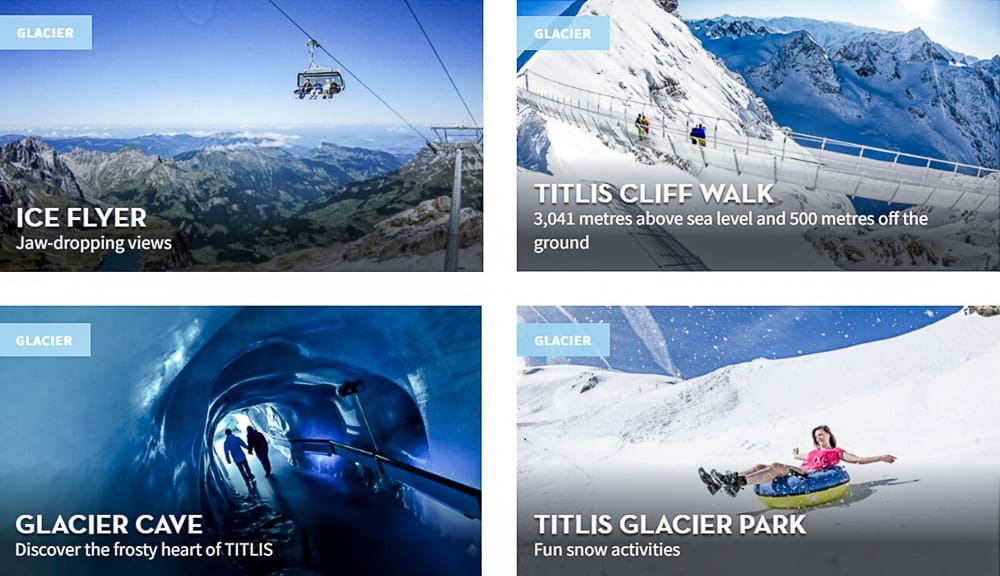 บนยอดเขาทิตลิส นอกจากทัศนียภาพอันงดงามแล้ว ยังมีสถานที่ท่องเที่ยวและกิจกรรมอื่นๆให้ทำอีกหลายอย่าง เช่น ถ้ำธารน้ำแข็ง (Glacier Cave), สะพานแขวนเดินข้ามหุบเขา (Cliff Walk), สนามเล่นหิมะ (Glacier Park) และกระเช้าชมวิว (Ice Flyer) นอกจากนี้ในฤดูหนาว ที่นี่ก็เป็นจุดหมายปลายทางยอดนิยมสำหรับการเล่นสกีและสโนว์บอร์ดด้วย