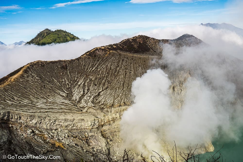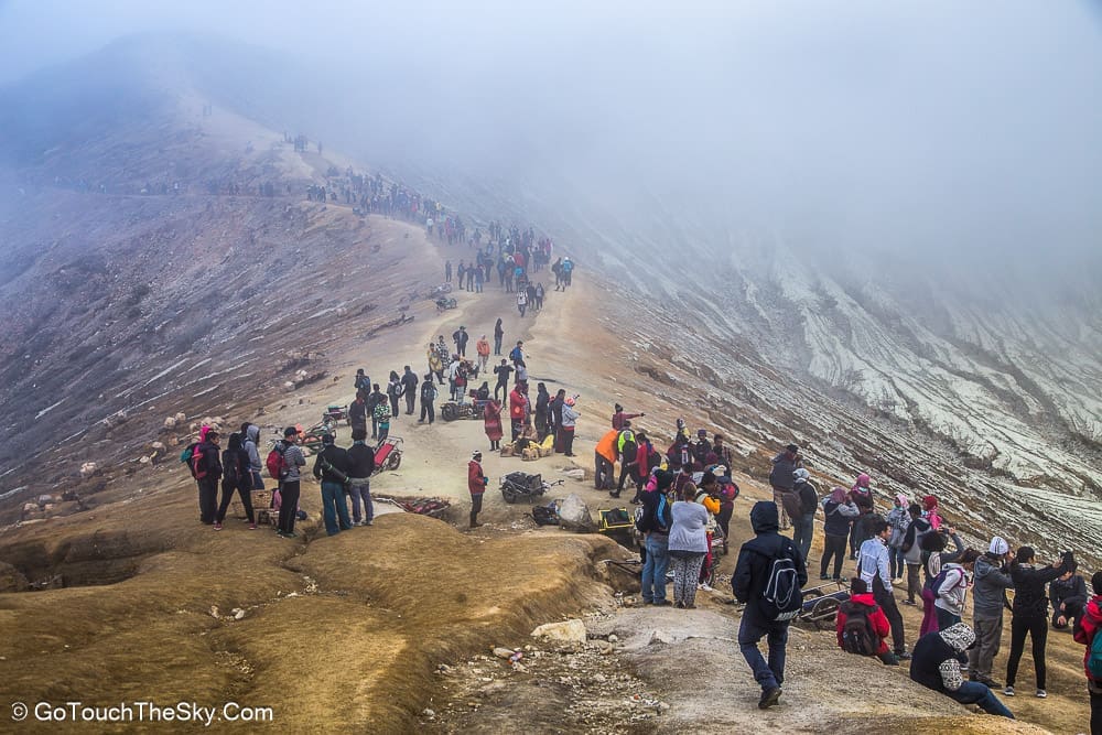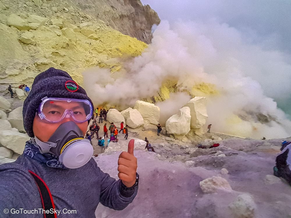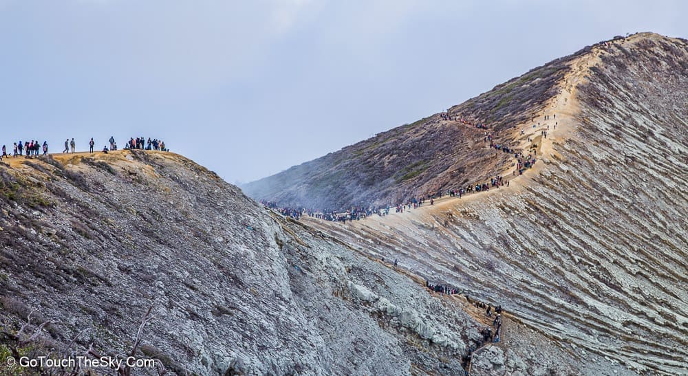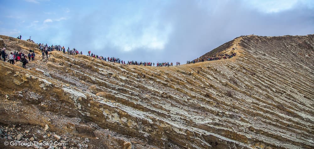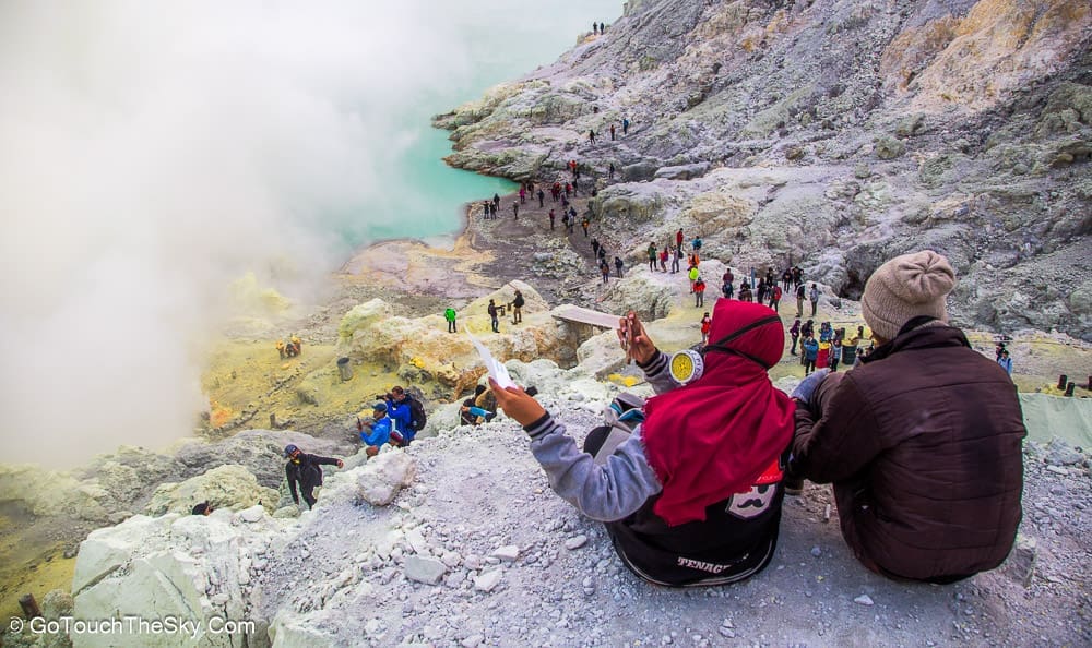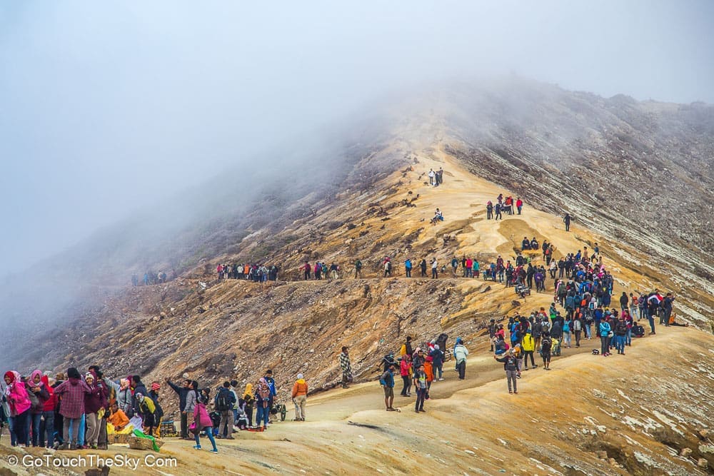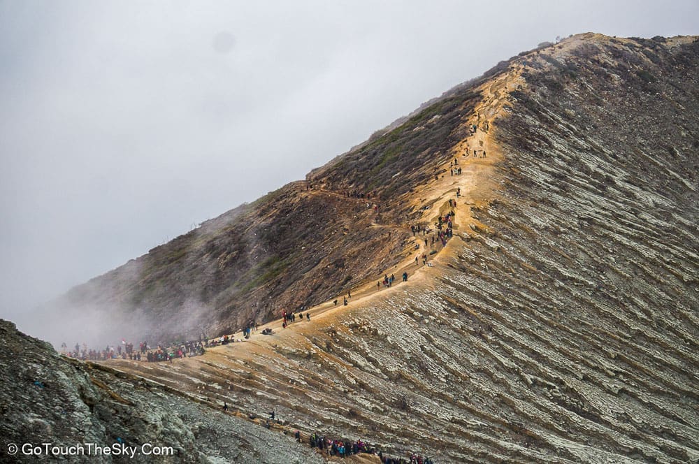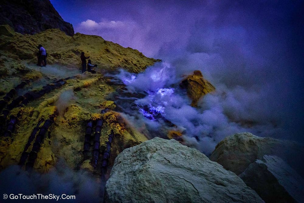 เราก้มหน้าเดินไปในความมืดอย่างไม่ลดละ หยุดพักหายใจเป็นช่วงๆ จำได้ว่าพอขึ้นไปถึงยอดเขา เราต้องเลี้ยวขวาเเล้วเดินไปตามสันเขาอีกพักใหญ่ๆ กว่าจะถึงจุดที่แยกลงไปยังปล่องด้านล่างอันเป็นจุดที่มีเหมืองกำมะถันและเปลวไฟสีน้ำเงิน (Blue Flame)