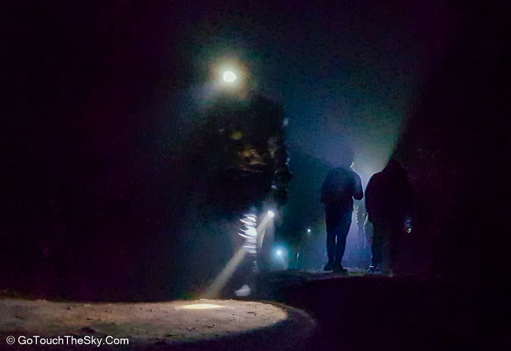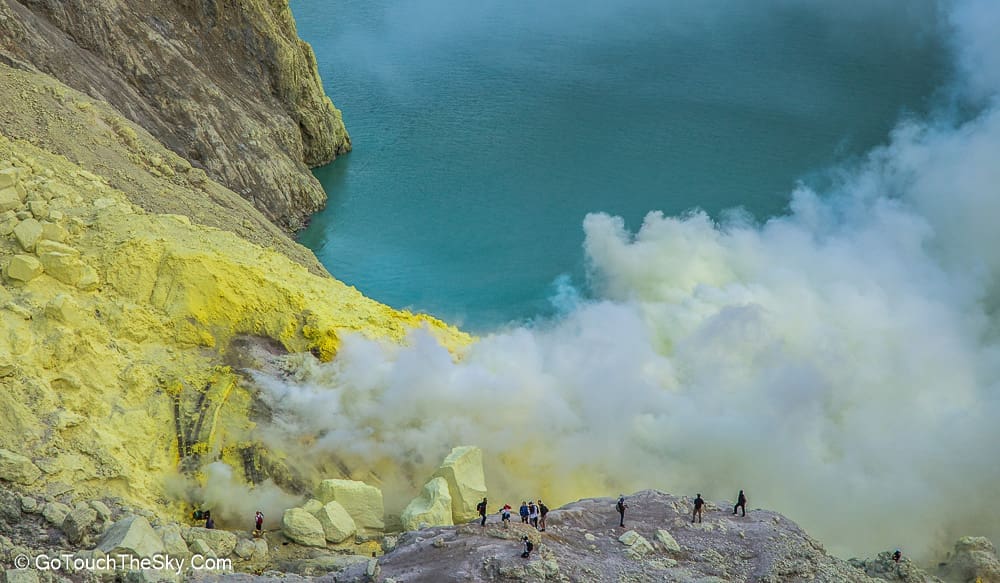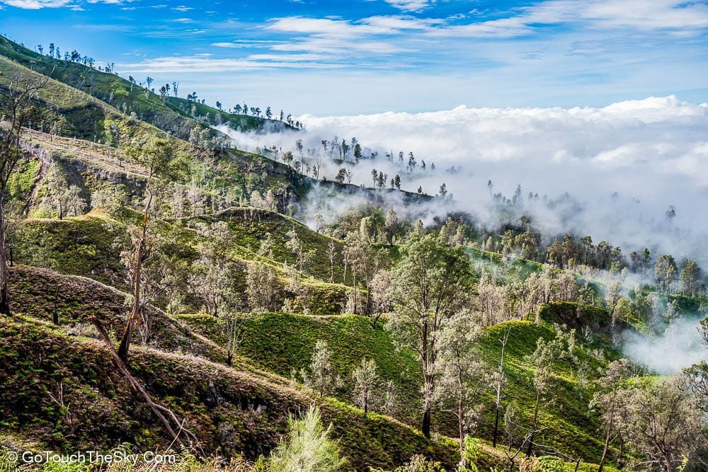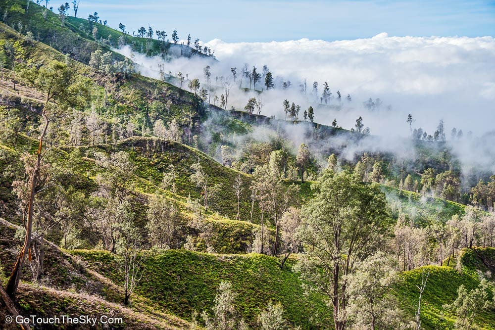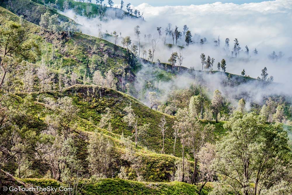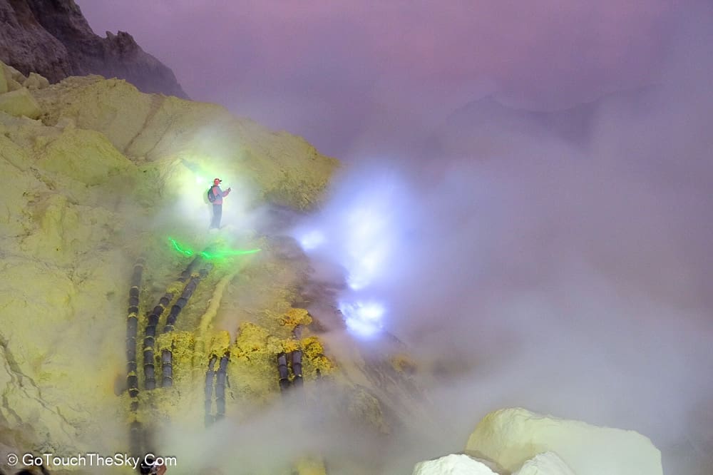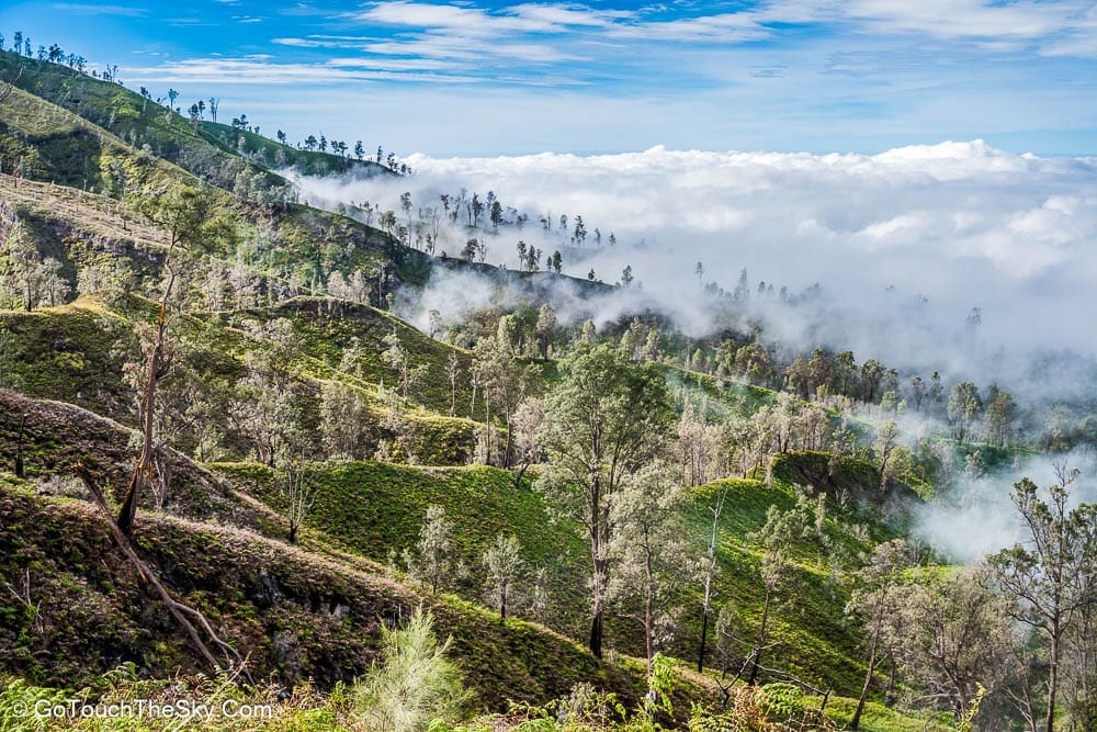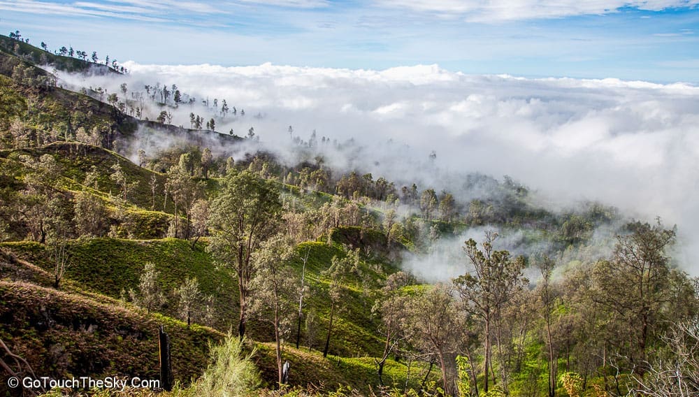 เราก้มหน้าเดินไปในความมืดอย่างไม่ลดละ หยุดพักหายใจเป็นช่วงๆ จำได้ว่าพอขึ้นไปถึงยอดเขา เราต้องเลี้ยวขวาเเล้วเดินไปตามสันเขาอีกพักใหญ่ๆ กว่าจะถึงจุดที่แยกลงไปยังปล่องด้านล่างอันเป็นจุดที่มีเหมืองกำมะถันและเปลวไฟสีน้ำเงิน (Blue Flame)