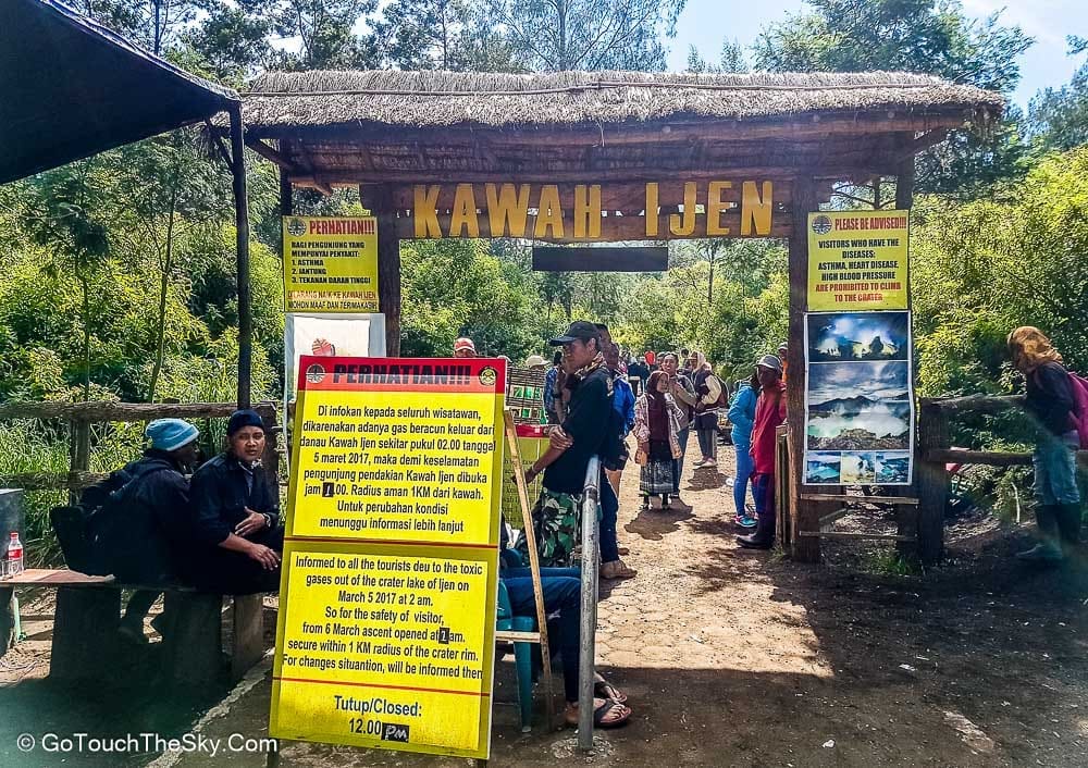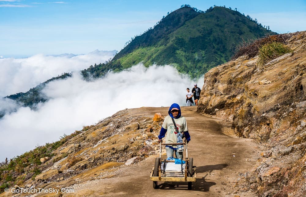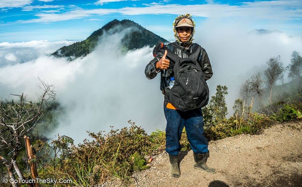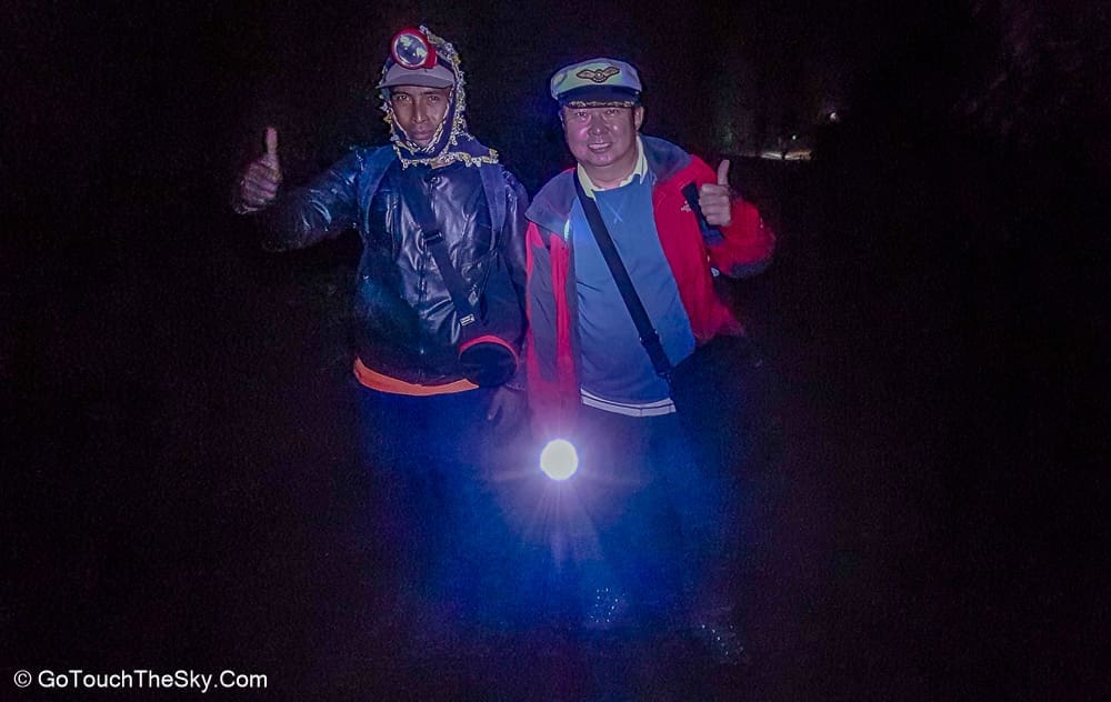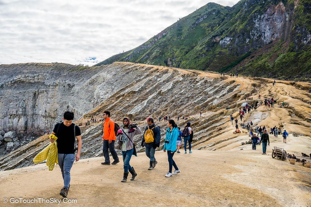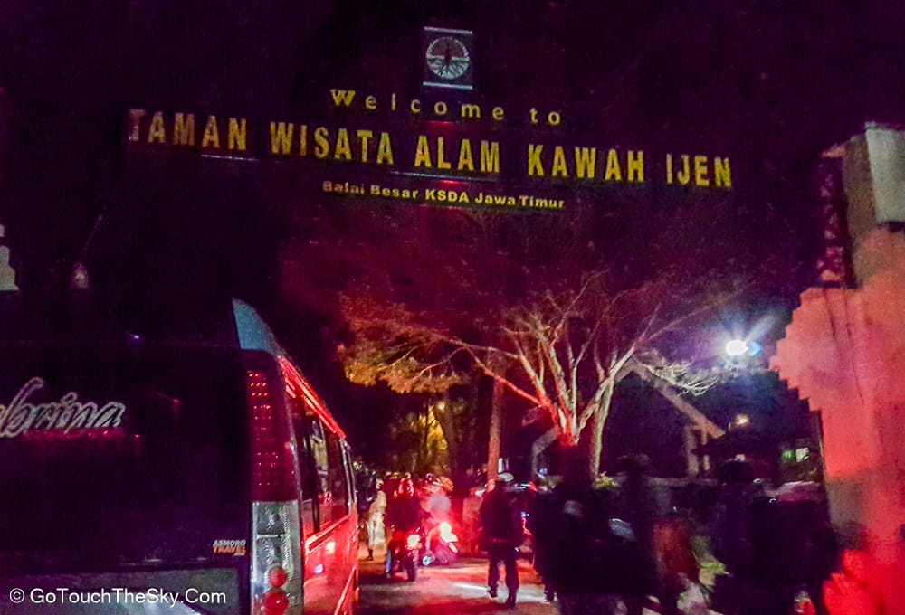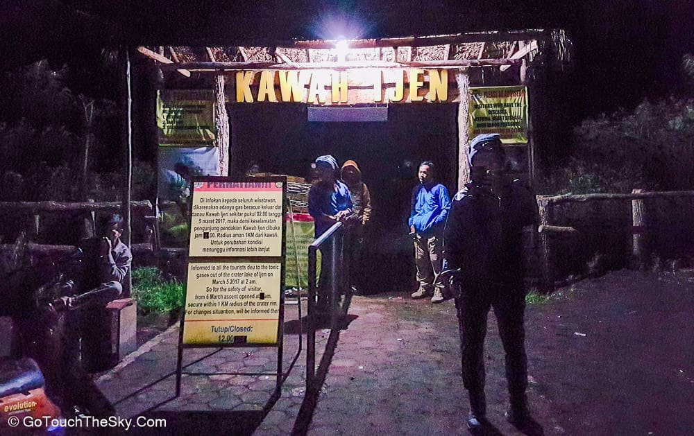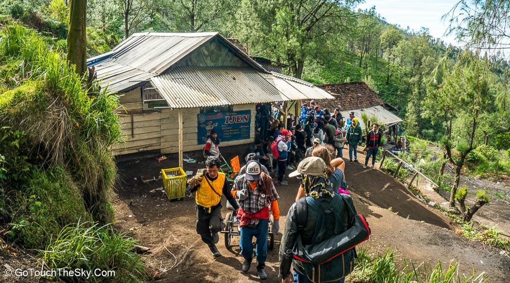 เวลาตีหนึ่ง เราออกเดินทางจากที่พักสู่บริเวณเชิงเขาอันเป็นจุดเริ่มต้นในการเดินเท้าขึ้นสู่ปากปล่องภูเขาไฟคาวาอีเจี้ยน มีนักท่องเที่ยวมารอ-เตรียมตัวอยู่แล้วเป็นจำนวนมาก คณะเราได้ติดต่อลูกหาบไว้เพื่ออำนวยความสะดวก เช่นช่วยแบกขนสัมภาระติดตัว (เป้หลัง, ขาตั้งกล้อง ฯลฯ) และที่เป็นประโยชน์มากที่สุดก็คือเขาจะเป็นพี่เลี้ยงคอยช่วยเหลือดูเเลเราด้วยตลอดการเดินเท้านี้ ต้องยอมรับและชื่นชมว่าลูกหาบพวกนี้มีความทรหดอดทนและเเข็งเเรงมาก เราสัมผัสได้ถึงความจริงใจ เอาใจใส่ และห่วงใยในความปลอดภัยของเรา คอยประกบ-ฉุดดึง และชี้เตือนในจุดที่อาจเป็นอันตราย (ซึ่งมีอยู่มากมาย) ให้กับเราตลอดเวลา