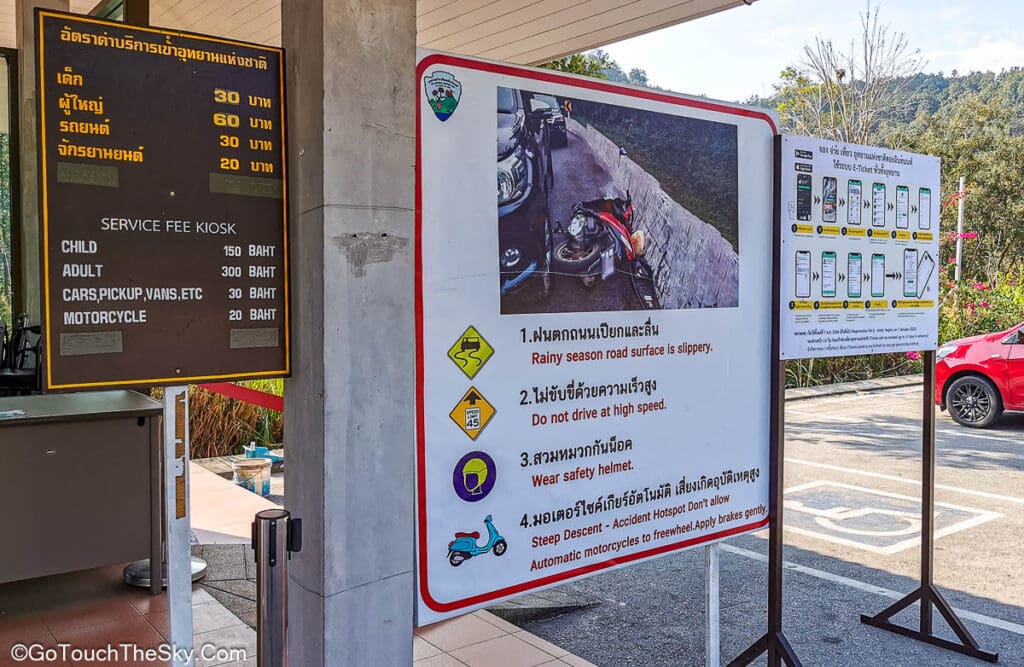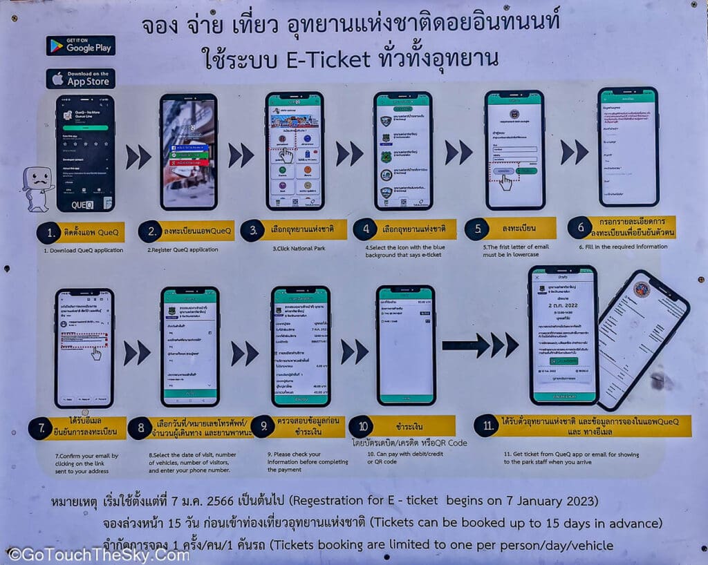 ปัจจุบันมีระบบการจองและซื้อบัตรผ่านเข้าอุทยานฯ แบบออนไลน์ผ่านแอพ QueQ ได้แล้ว สามารถสแกน QR code จากในแอพกับนายตรวจที่ด่านได้เลย สะดวกสบายกว่าการลงจากรถเพื่อไปเข้าคิวซื้อที่เค้าท์เตอร์จากเจ้าหน้าที่ โดยสามารถจอง-ซื้อล่วงหน้าได้ 15 วันก่อนเดินทาง (ด่านเปิด 05.00-17.30 น.)