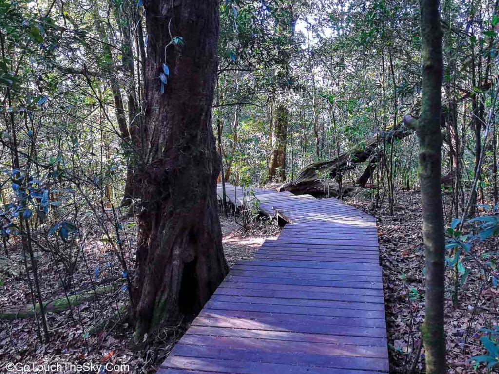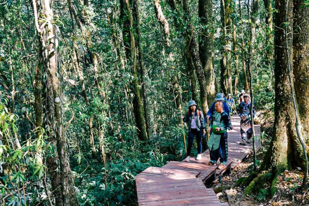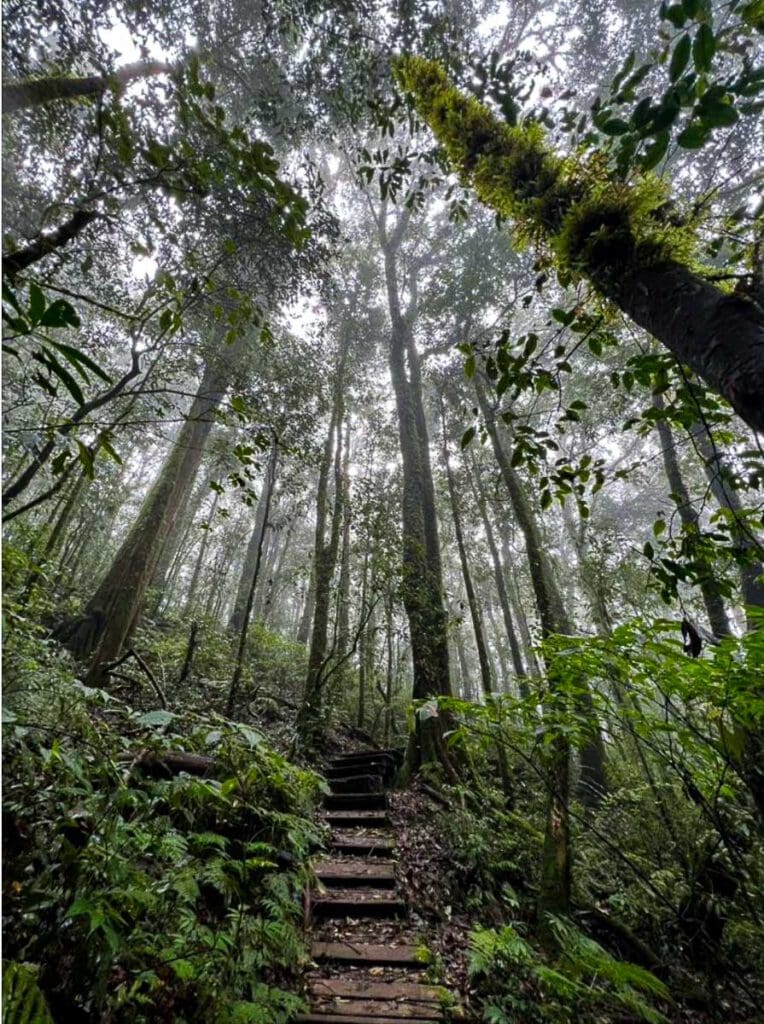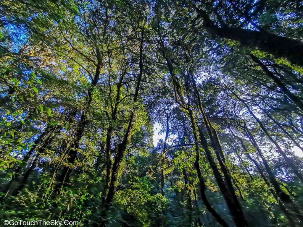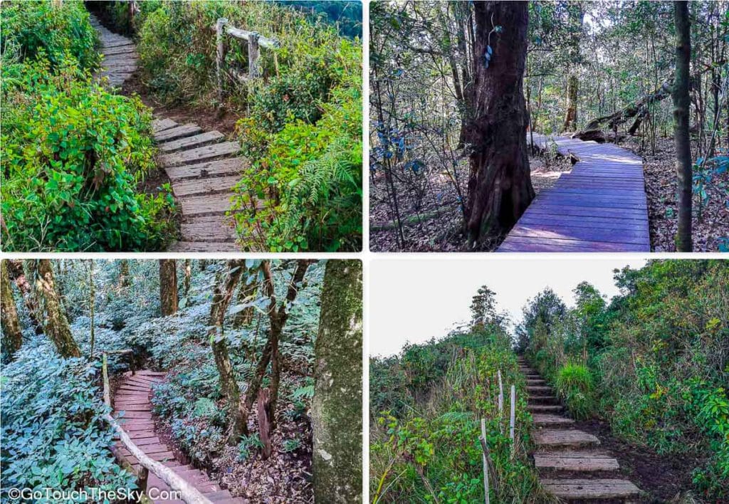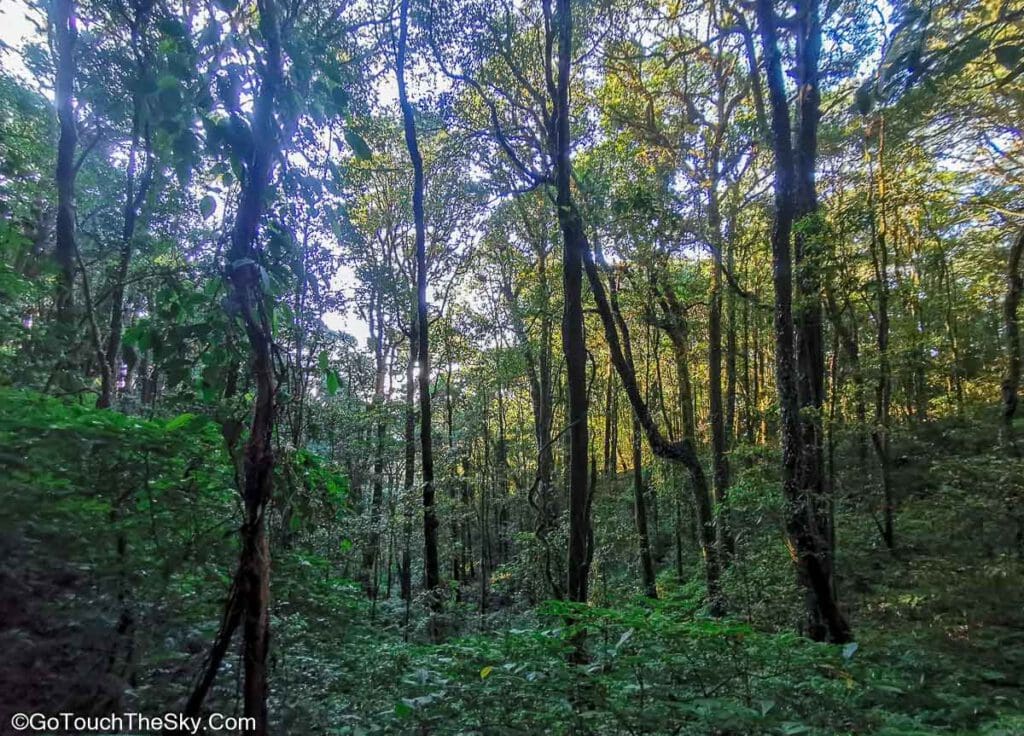 เส้นทางช่วงแรกเป็นทางเดินลาดชันขึ้นไปตามเนิน แต่เป็นทางที่ได้รับการพัฒนาไว้แล้วเป็นอย่างดี มีบันไดสลับกับทางเดินไว้อำนวยความสะดวกตลอดทาง บรรยากาศในช่วงแรกเป็นป่าดิบชื้น (บางครั้งเรียกว่า ป่าเมฆ – Cloud Forest) มีมอสและเฟิร์นขึ้นอยู่อย่างหนาแน่นตามลำต้นของไม้ใหญ่ที่แข่งขันกันเติบโตเพื่อรับแสงอาทิตย์