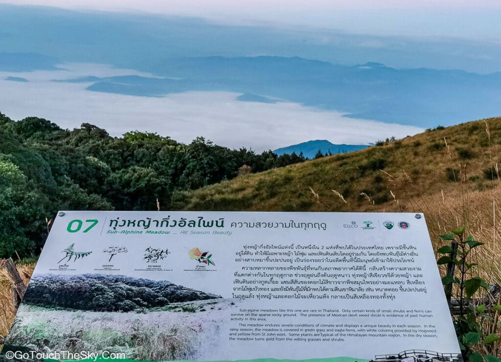 หลังจากผ่านดงทึบของป่าดิบชื้น จะทะลุออกสู่ ทุ่งหญ้าบนเขา ที่มีบรรยากาศโปร่ง โล่ง เย็นสบาย เห็นไอหมอกเมฆไหลมาอยู่เบื้องหน้า ซึ่งคาดไม่ถึงเลยว่าจะอยู่หลังม่านอันหนาทึบของป่าที่เพิ่งเดินผ่านมา หากสังเกตดีๆตามทางเดินเราอาจพบมูลหรือร่องรอยขุดคุ้ยหาอาหารของสัตว์ป่าอยู่ด้วย ทุ่งหญ้ากึ่งอัลไพน์ (Alpine Savana) นี้จะเปลี่ยนจากสีเขียวขจึในช่วงหลังฤดูฝนไปเป็นสีน้ำตาลอ่อน (บางคนเรียกว่าสีทอง) อย่างพรั่งพร้อมในช่วงฤดูแล้ง