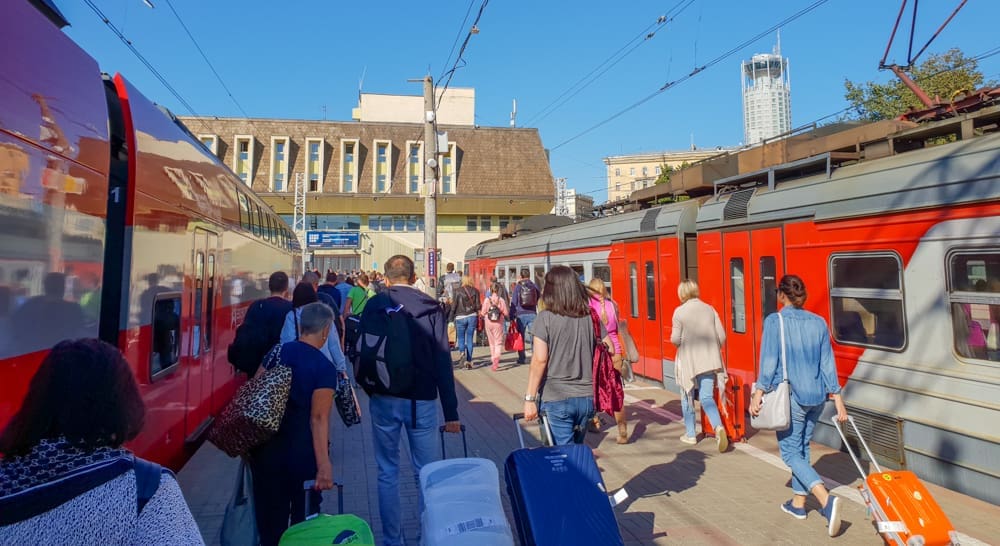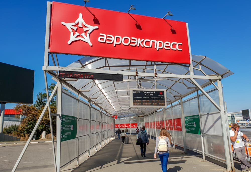 ออกจากอาคารผู้โดยสารโดยใช้ทางออกที่ 3 เดินไปตามทางที่มีป้ายสีเเดงภาษารัสเซีย (ป้ายที่นี่ส่วนใหญ่จะไม่มีภาษาอังกฤษกำกับ) เพื่อไปยังสถานีรถไฟ Aeroexpress