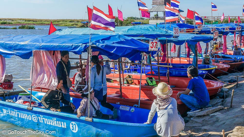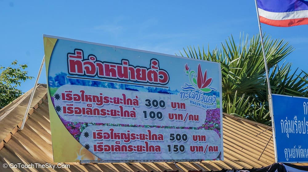 เรือที่จะพาเราเที่ยวชมทะเลบัวแดง เป็นของกลุ่มวิสาหกิจชุมชนของชาวบ้านตำบลบ้านเดียม ค่าเช่าเรือสำหรับการเที่ยวชมระยะใกล้ๆ ราคา 100-300 บาท ส่วนระยะไกลราคา 150-500 บาท ใช้เวลาประมาณ 45 นาที-1 ชั่วโมงครึ่ง