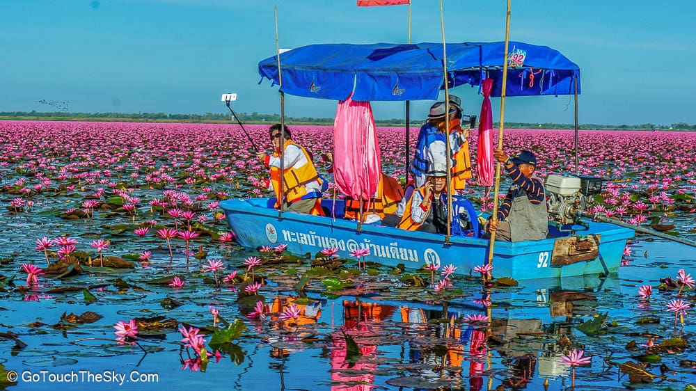 แล่นเรือไปตามบึงน้ำ ชื่นชมความงามและถ่ายรูปบัวแดงจนอิ่มใจแล้ว ก็กลับเข้าฝั่งเมื่อเเดดเริ่มแรงพอดี..