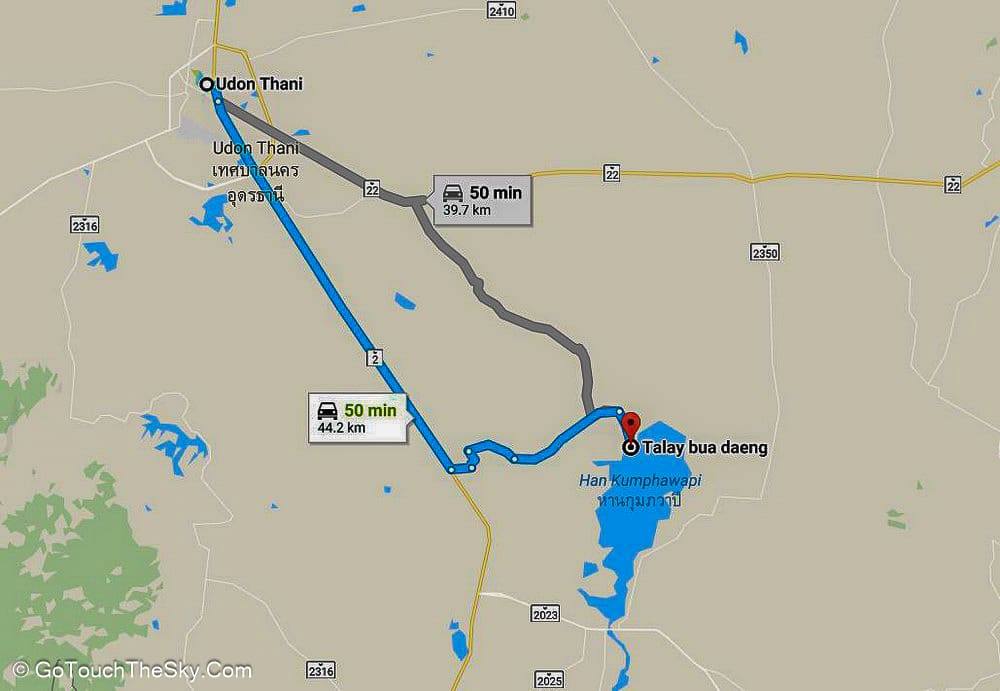 จากตัวเมืองอุดรธานีถึงจุดบริการลงเรือเพื่อชมทะเลบัวแดงที่บึงหนองหาน ตำบลบ้านเดียม มีระยะทาง 40 กิโลเมตร ใช้เวลาเดินทางประมาณ 50 นาที ช่วงเวลาที่เหมาะสมในการไปชมทะเลบัวแดงคือช่วงเช้าตรู่จนถึงเวลาประมาณ 11:00 น. อันเป็นช่วงเวลาที่ดอกบัวสายหรือบัวแดงจะบานชูช่อแตกกอเต็มบึง