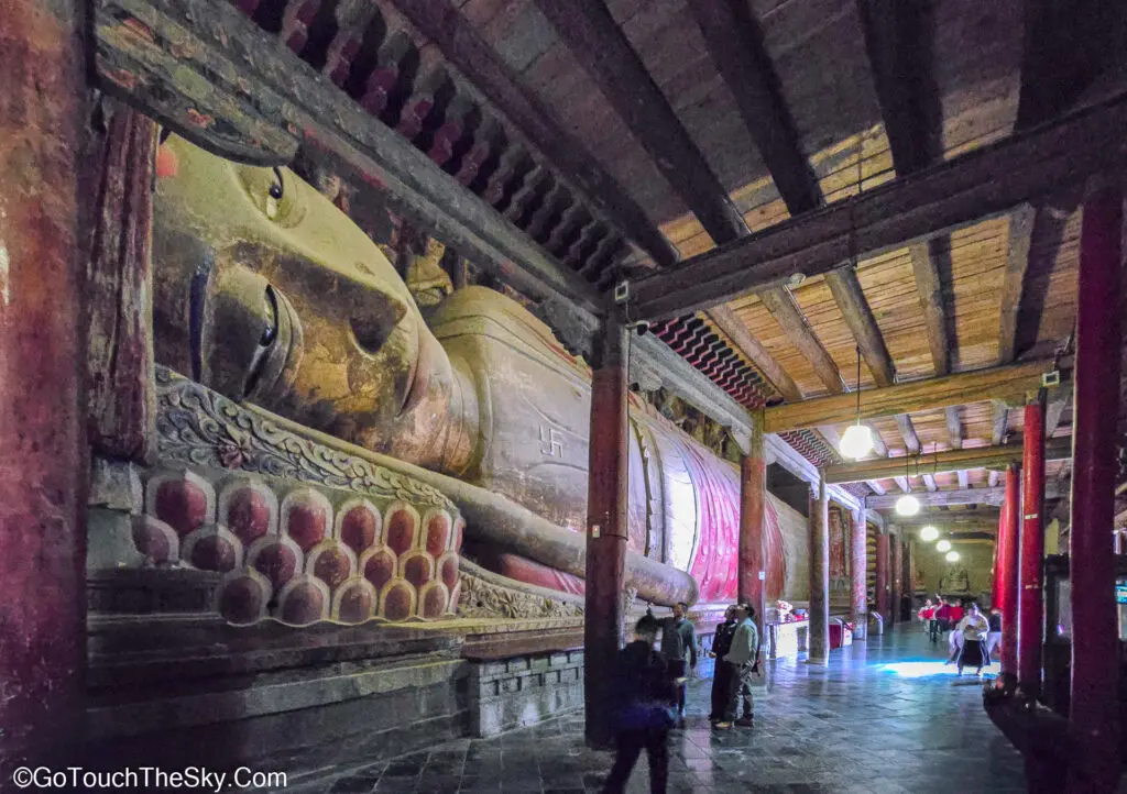 ไฮไลท์ที่ห้ามพลาด: หัวใจของวัดแห่งนี้คือ “พระนอน” (Reclining Buddha) ที่ประดิษฐานโดดเด่นภายในวิหารหลัก องค์พระมีความยาวถึง 34.5 เมตร และกว้าง 7.5 เมตร นับเป็นพระพุทธรูปปางไสยาสน์โครงไม้บุด้วยดินเหนียวที่ใหญ่ที่สุดในเอเชีย อีกทั้งยังเป็นผลงานสถาปัตยกรรมทางพุทธศาสนาจากยุคราชวงศ์เซี่ยตะวันตกที่คงสภาพสมบูรณ์ที่สุดเท่าที่หลงเหลืออยู่ในปัจจุบัน