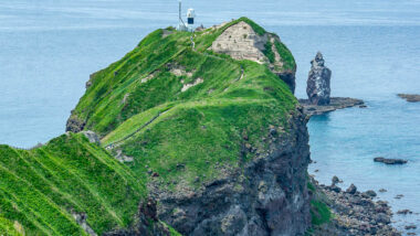 ภาพสถานที่ท่องเที่ยวแห่งหนึ่งของเกาะฮอกไกโด เป็นภาพของแหลมหินที่ยื่นออกไปในทะเล มีทางเดินเล็กๆทอดยาว-คดเคี้ยวออกไปตามเนินเขาเตี้ยๆ สีเขียวที่อยู่เบื้องหน้า ล้อมรอบด้วยเวิ้งทะเลสีครามทั้งสองด้าน...