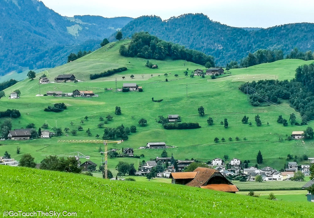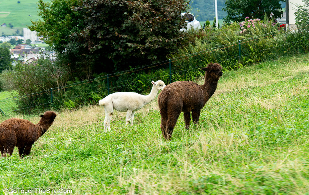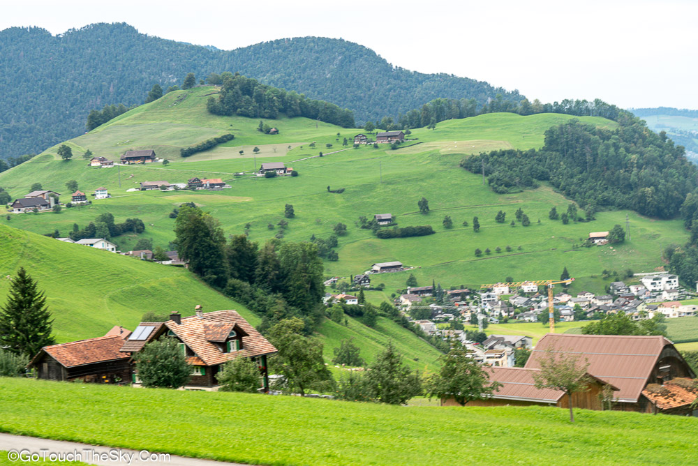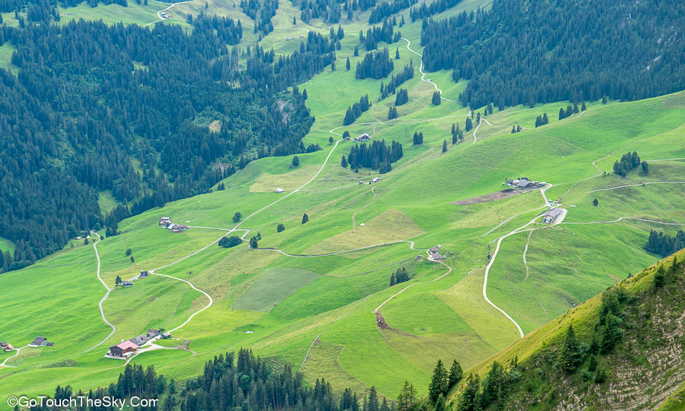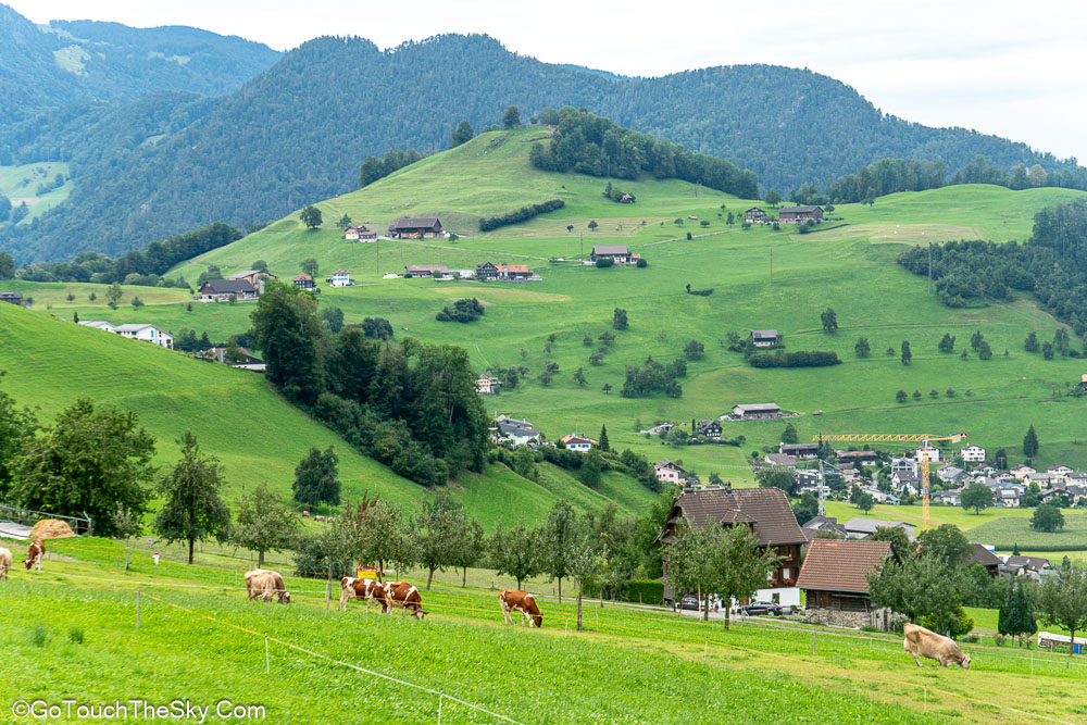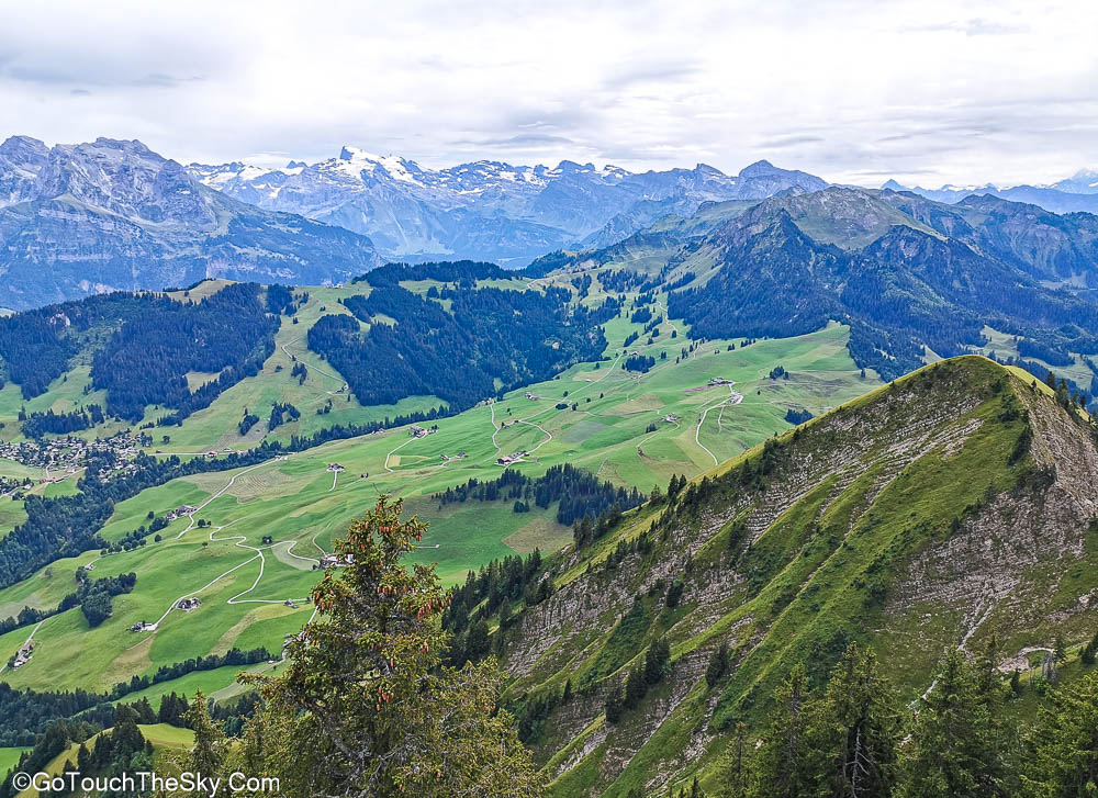 ทิวทัศน์เบื้องหน้าที่เห็นอยู่ไกลๆ คือเทือกเขาแอลป์ยาวกว่า 100 กิโลเมตร ใกล้เข้ามาเป็นภูเขาสลับกับทุ่งหญ้าสีเขียวชอุ่ม และทะเลสาบอีกหลายแห่ง