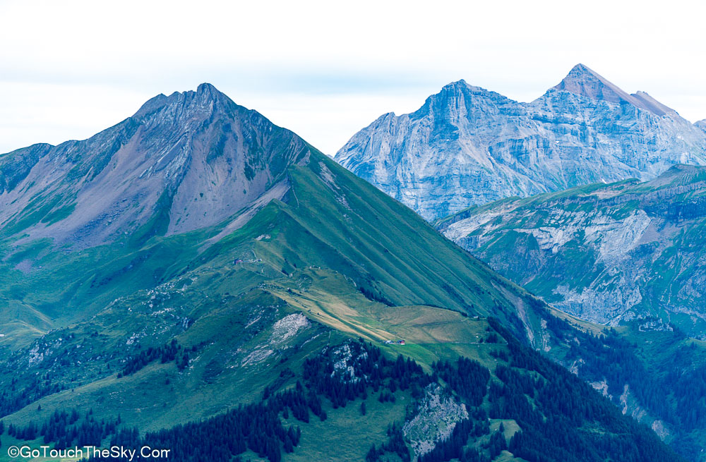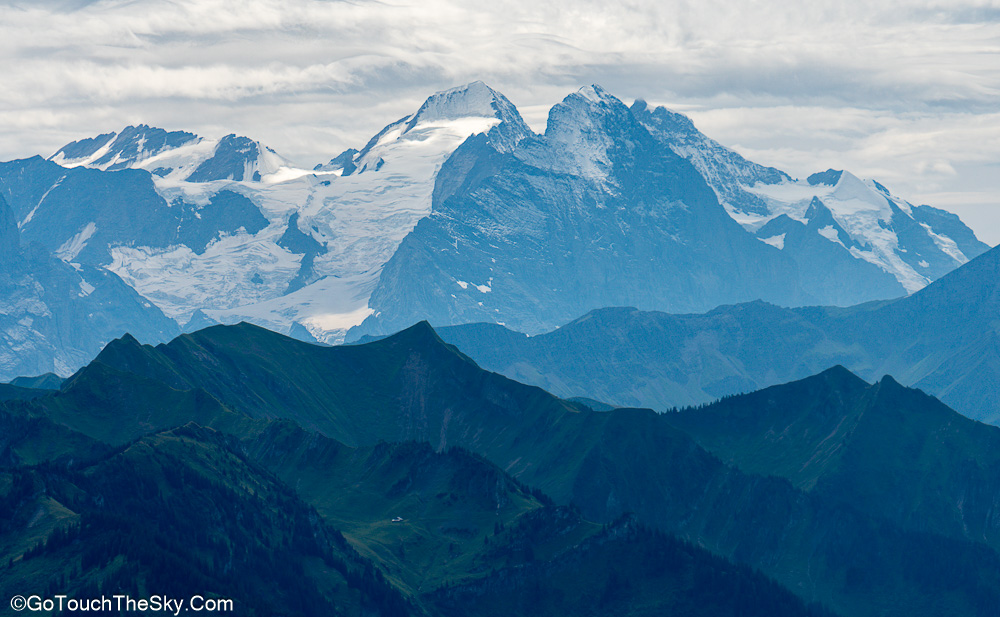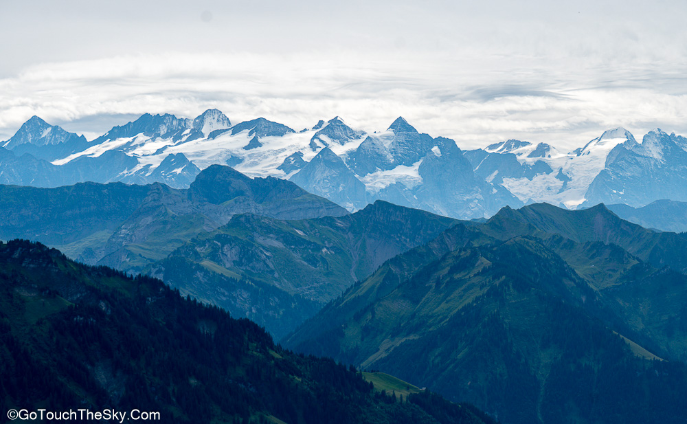 ในวันที่อากาศแจ่มใส จะสามารถมองเห็นได้ไกลถึงยอดเขาจุงเฟรา (Jungfrau) ที่ซ่อนตัวอยู่หลังยอดเขา Eiger และ Mönch